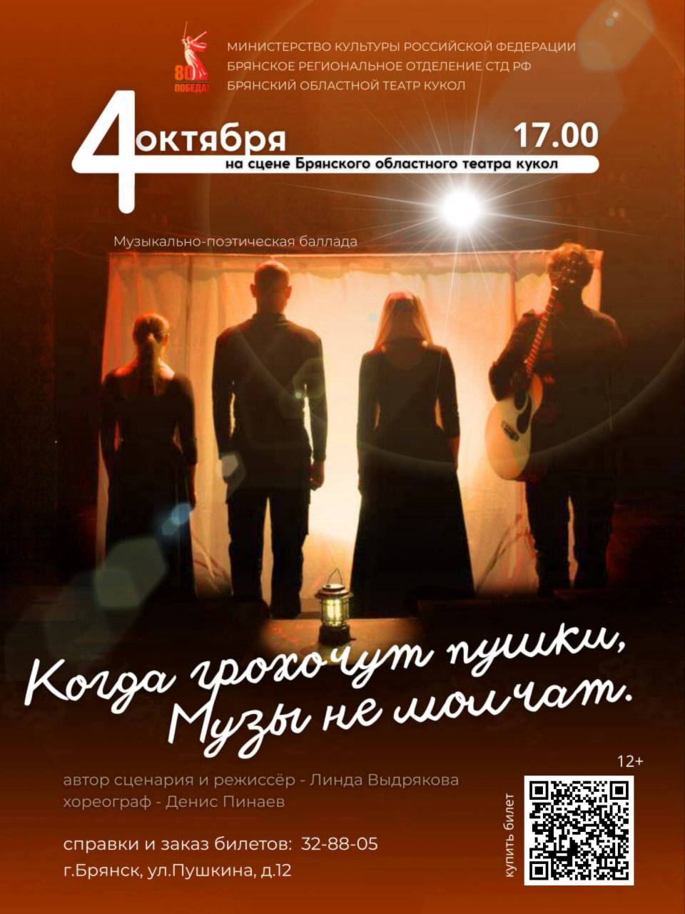 Брянское региональное отделение Союза театральных деятелей России приглашает учеников и педагогов на музыкально-поэтическую балладу «Когда грохочут пушки, музы не молчат», которая состоится: