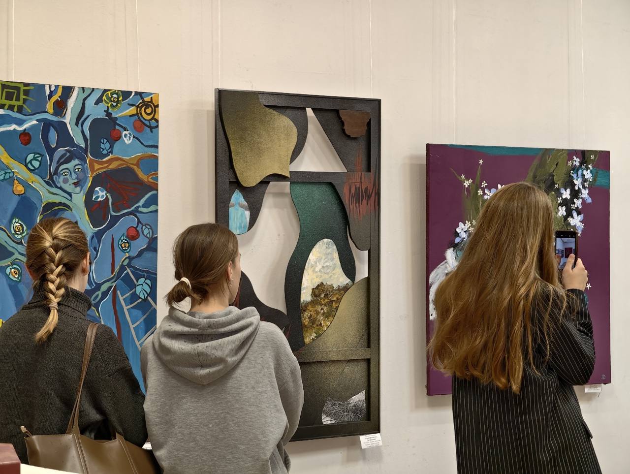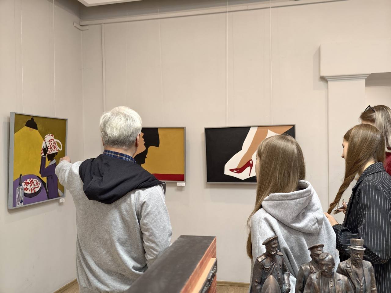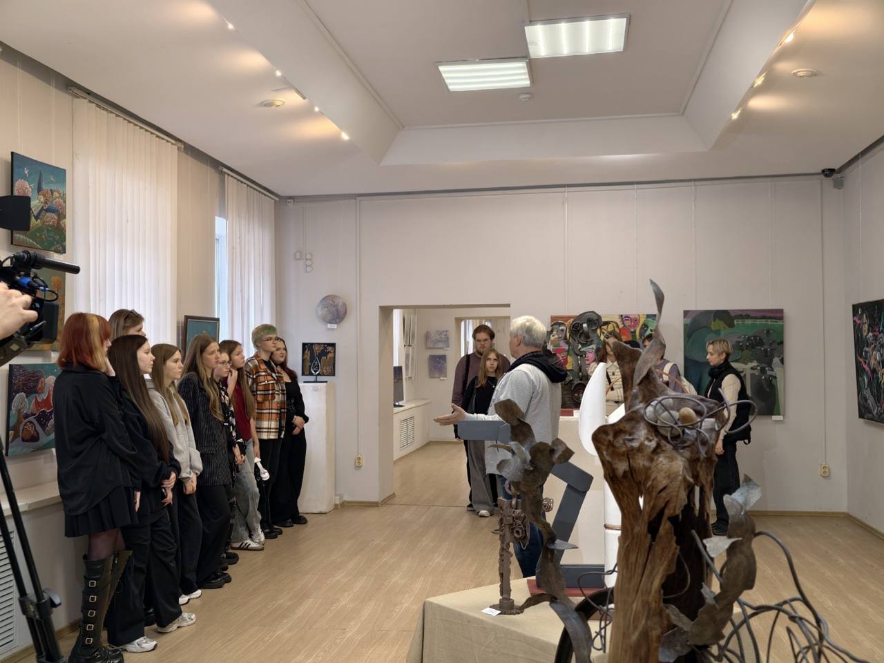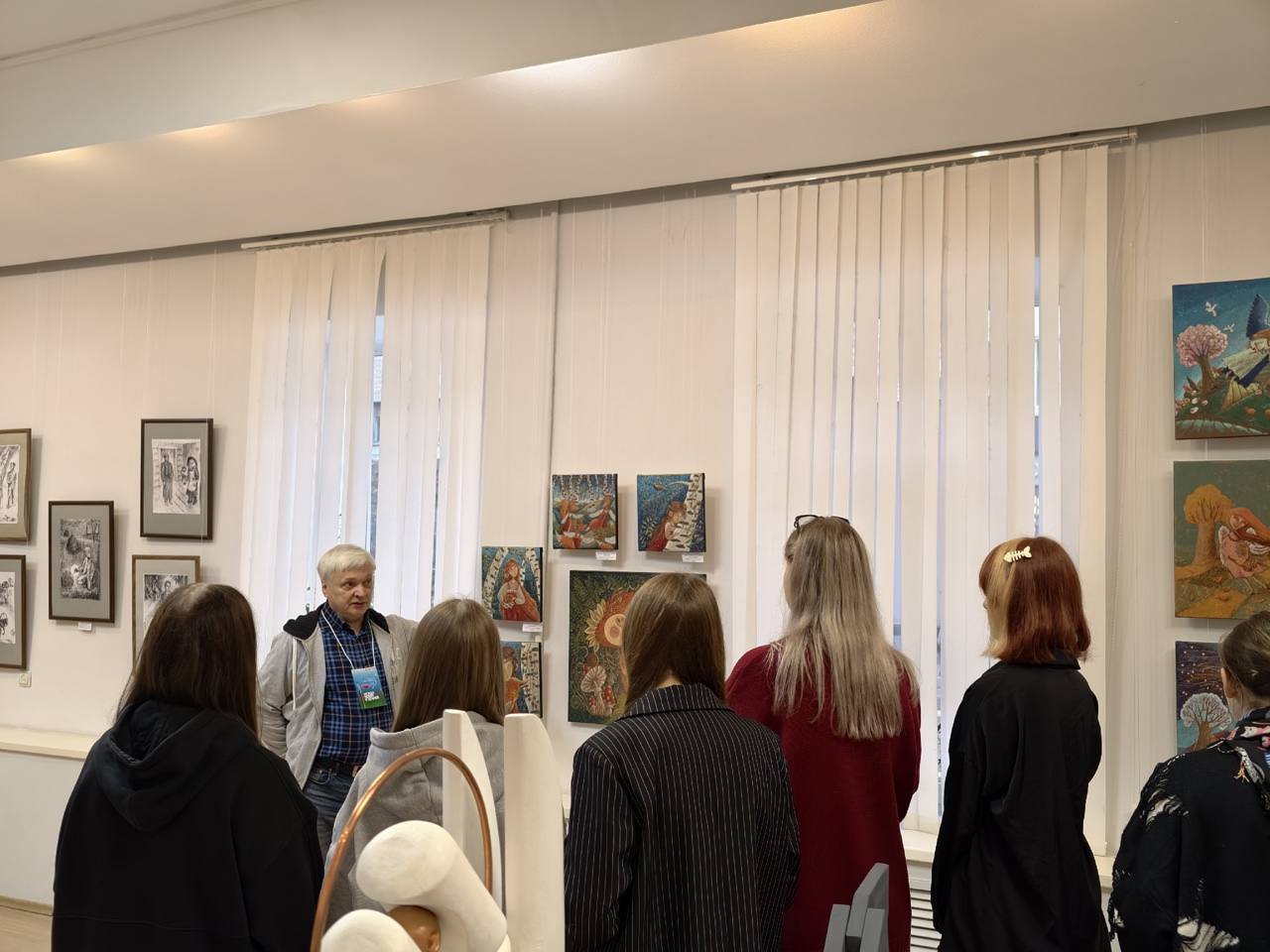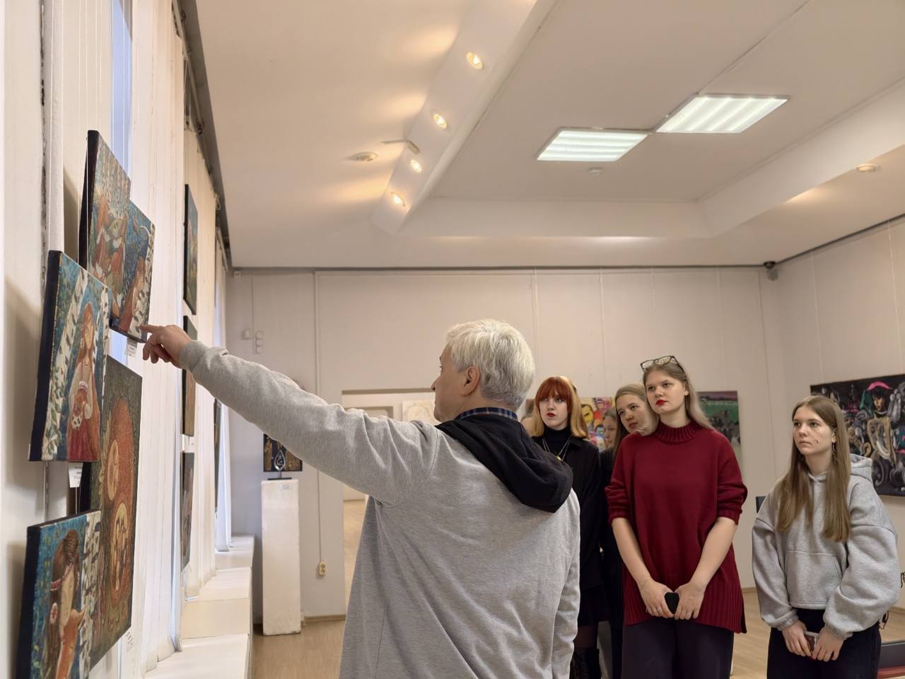 Александр Александрович провел для студентов экскурсию по выставке, рассказал символику, технику и историю создания многих работ.