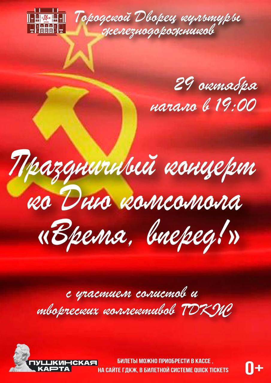 Праздничный концерт ко Дню комсомола "ВРЕМЯ, ВПЕРЕД!", посвященный комсомольскому движению и славным страницам нашей истории. Это событие станет настоящим праздником для тех, кто ценит прошлое и стремится к светлому будущему нашей Родины.