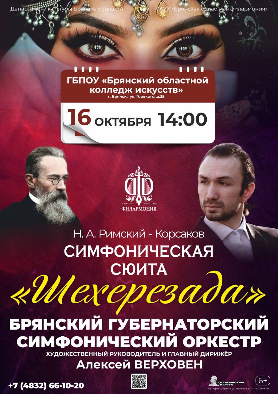 16 октября в 14.00 в концертном зале Брянского областного колледжа искусств (ул. Горького, 35) состоится концерт губернаторского симфонического оркестра, сюиты Н. А. Римского- Корсакова "Шахерезада".