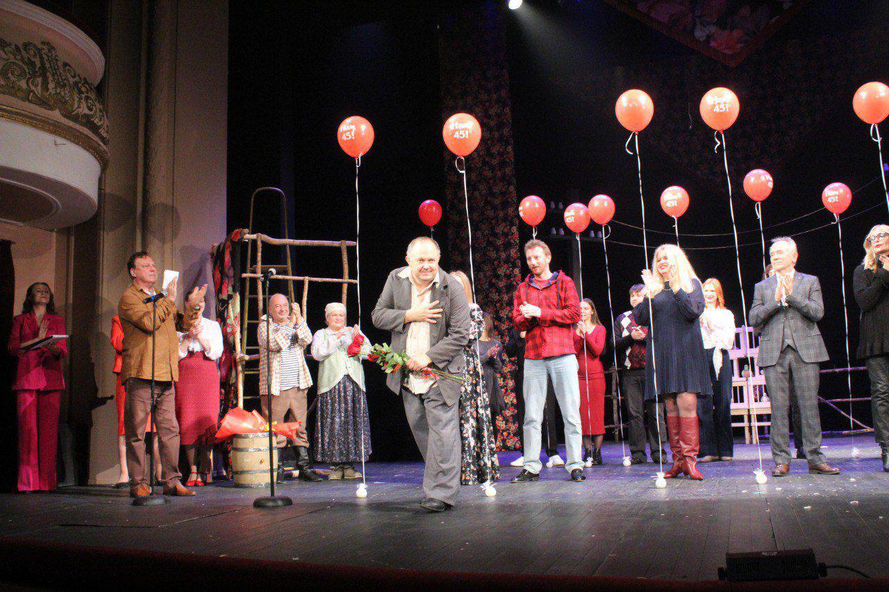 Также слова поздравления были адресованы ведущему мастеру сцены Алексею Чубакову - исполнителю главной роли Василия Кузякина в спектакле «Любовь и голуби». Алексей Чубаков недавно получил высокое государственное звание – Заслуженный артист России.