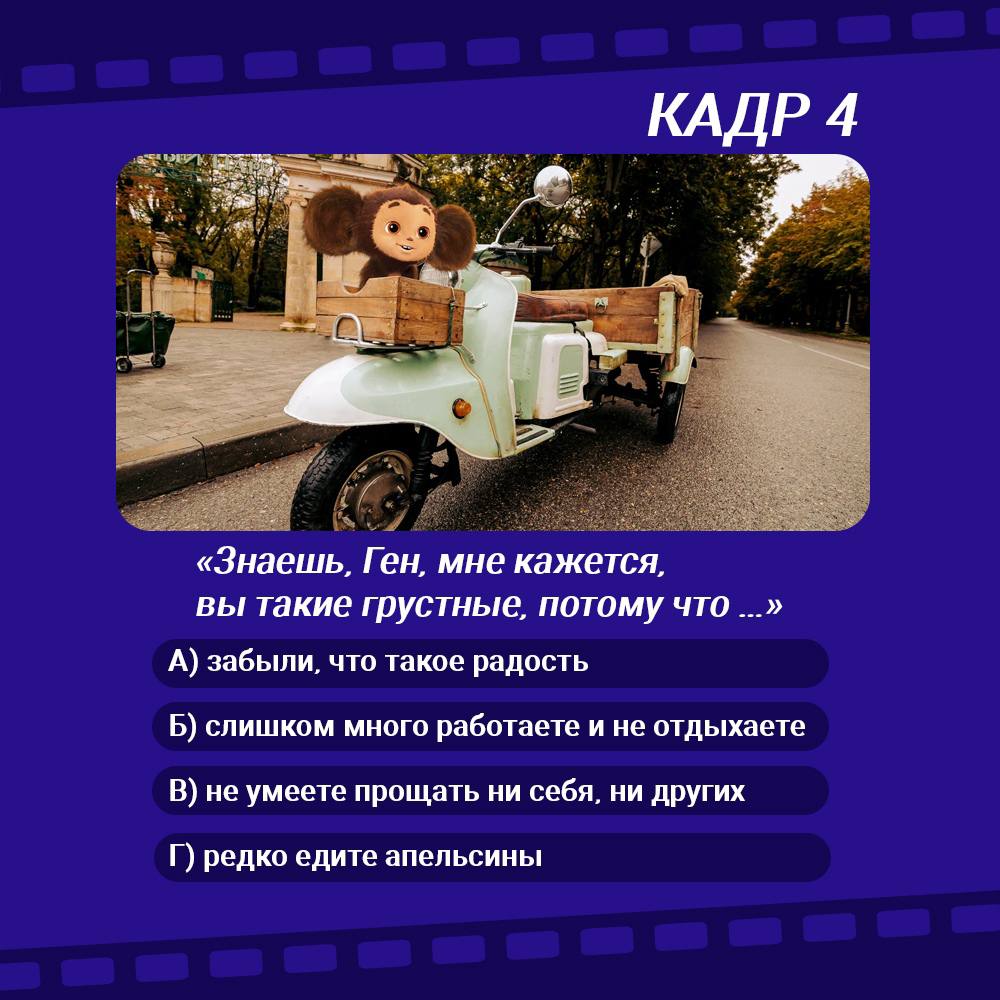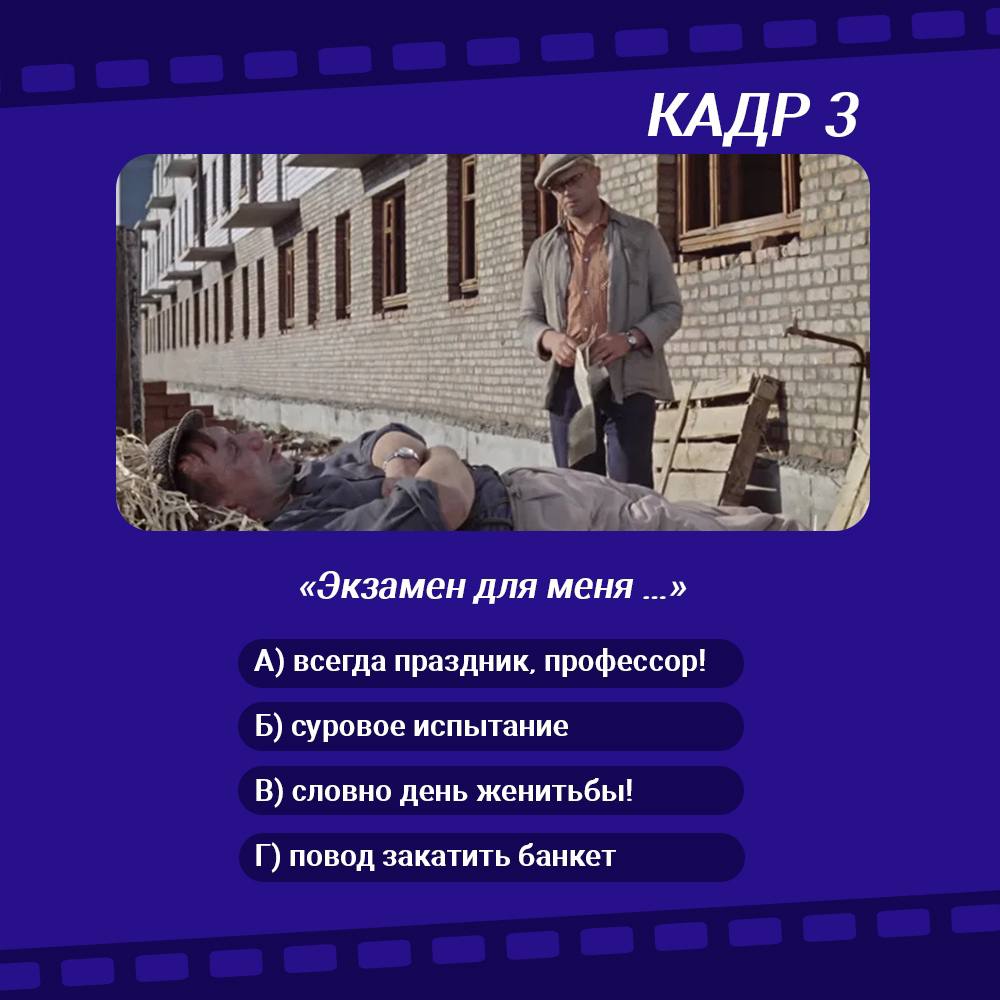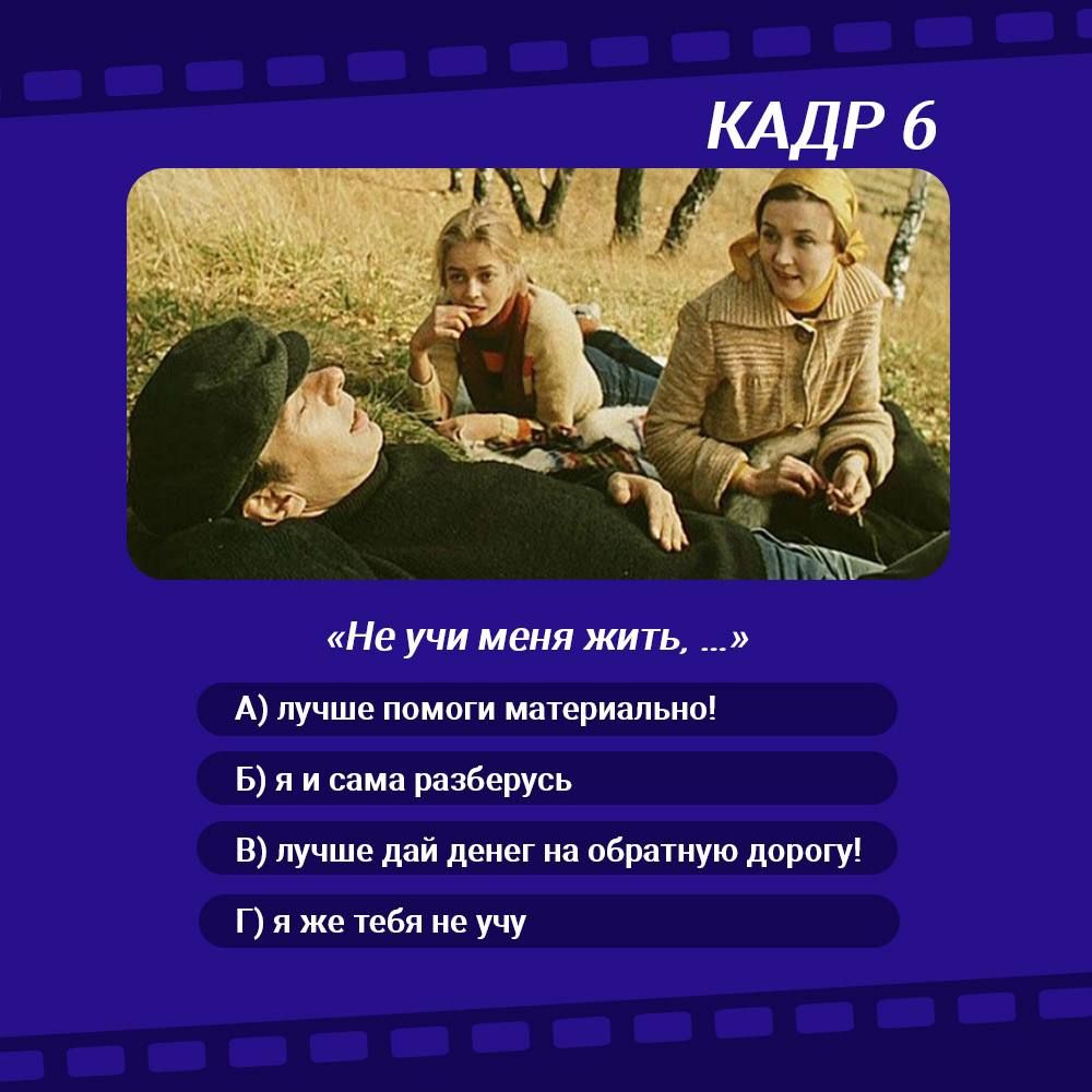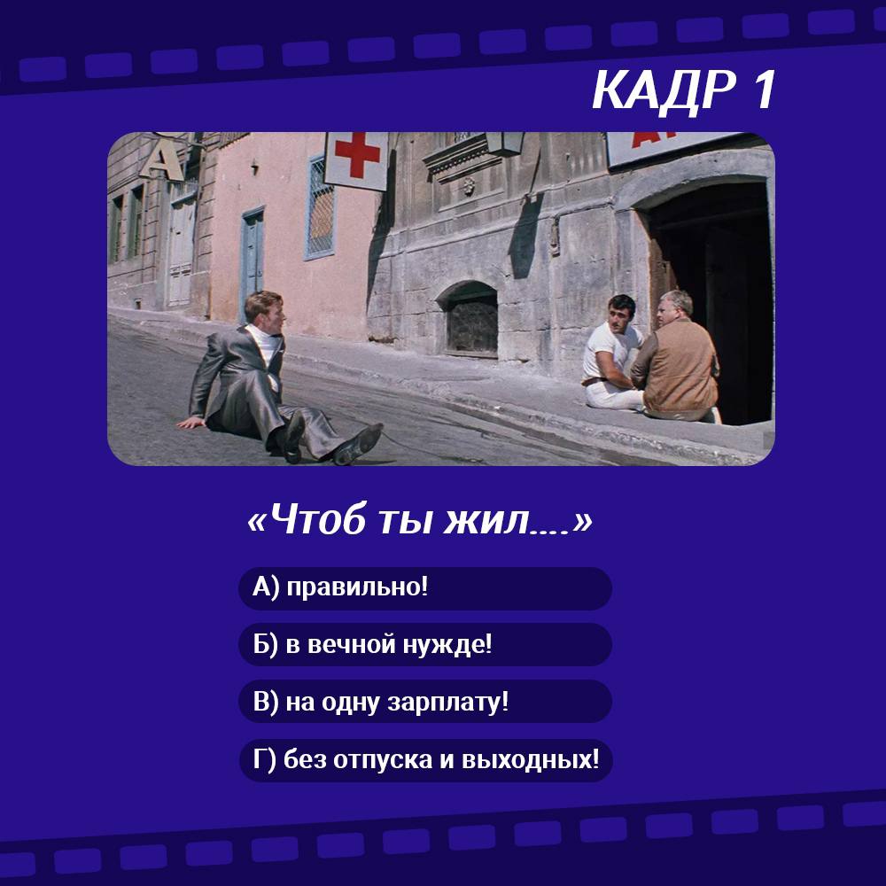 Мы вам кадр из фильма, начало известной фразы из него и варианты продолжения этой фразы. А с вас — номер карточки и буковка с правильным вариантом. Попробуем?