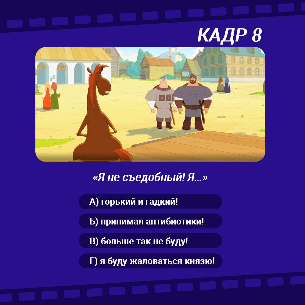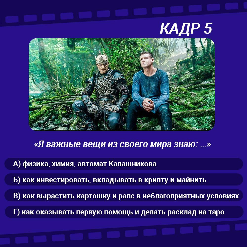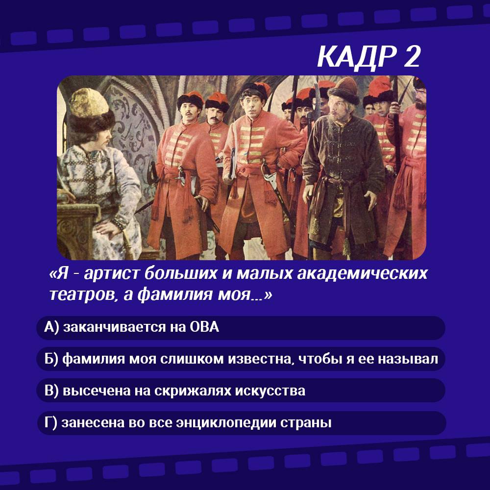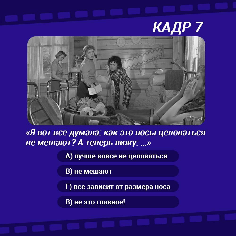 Мы вам кадр из фильма, начало известной фразы из него и варианты продолжения этой фразы. А с вас — номер карточки и буковка с правильным вариантом. Попробуем?