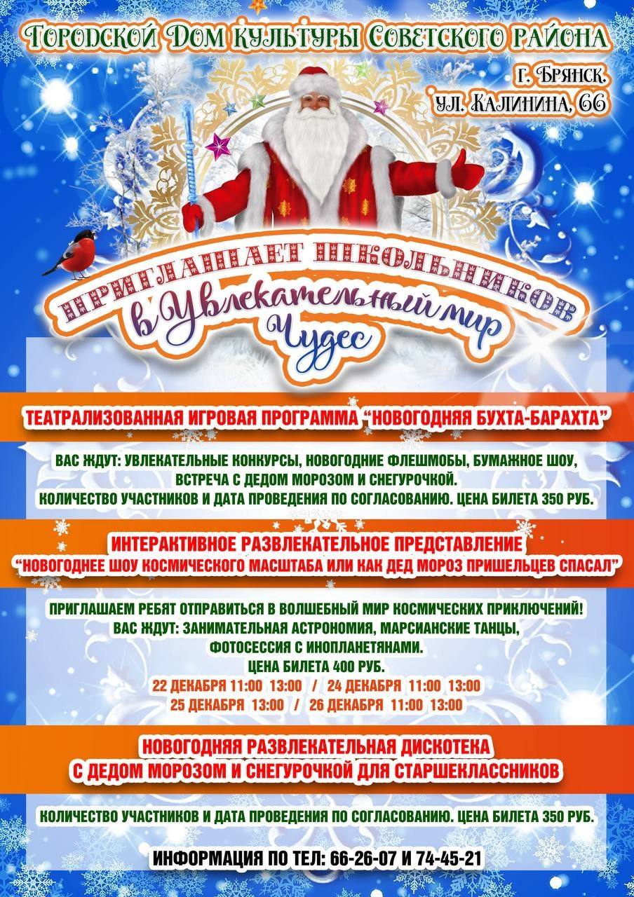 Городской Дом культуры Советского района г. Брянска с радостью распахивает свои двери для всех школьников, чтобы подарить им самые яркие и волшебные новогодние впечатления!
