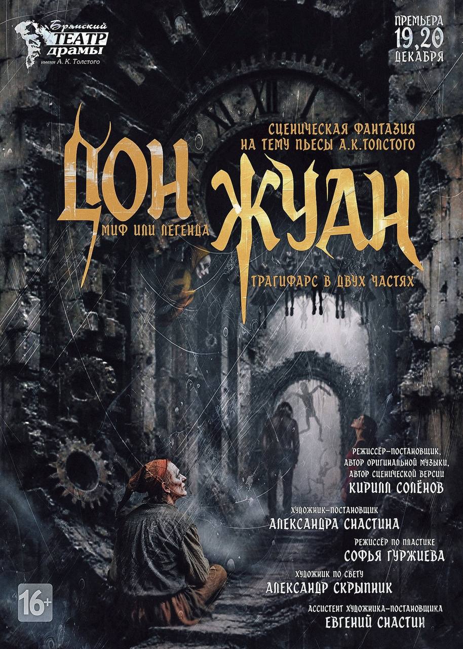 В Брянском областном театре драмы им. А.К. Толстого 20 декабря в 18.00 состоится премьера спектакля «Дон Жуан. Миф или легенда». Это трагифарс в двух частях, сценическая фантазия на тему пьесы А.К. Толстого.