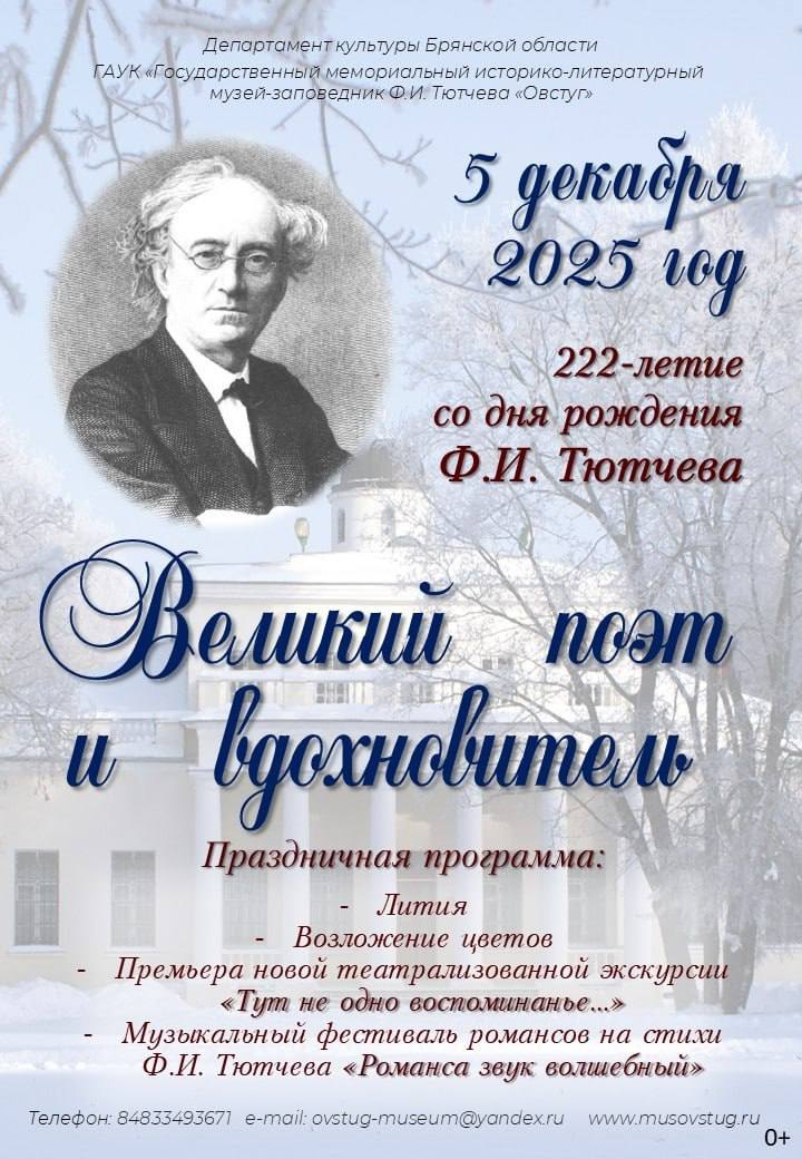 5 декабря музей-заповедник Ф.И. Тютчева «Овстуг» приглашает на торжественное мероприятие «Великий поэт и вдохновитель», приуроченное к 222-летию со дня рождения великого русского поэта.