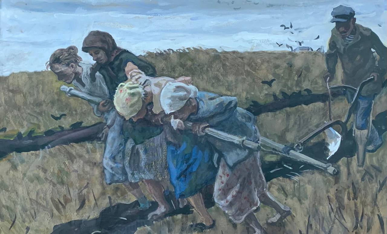 На полотне изображены жители села Овстуга, возвращавшие колхоз к жизни после войны. Их труд на полях — это не просто восстановление хозяйства, а продолжение борьбы за Родину. Их хлеб, политый потом и слезами утрат, стал символом стойкости и мужества.