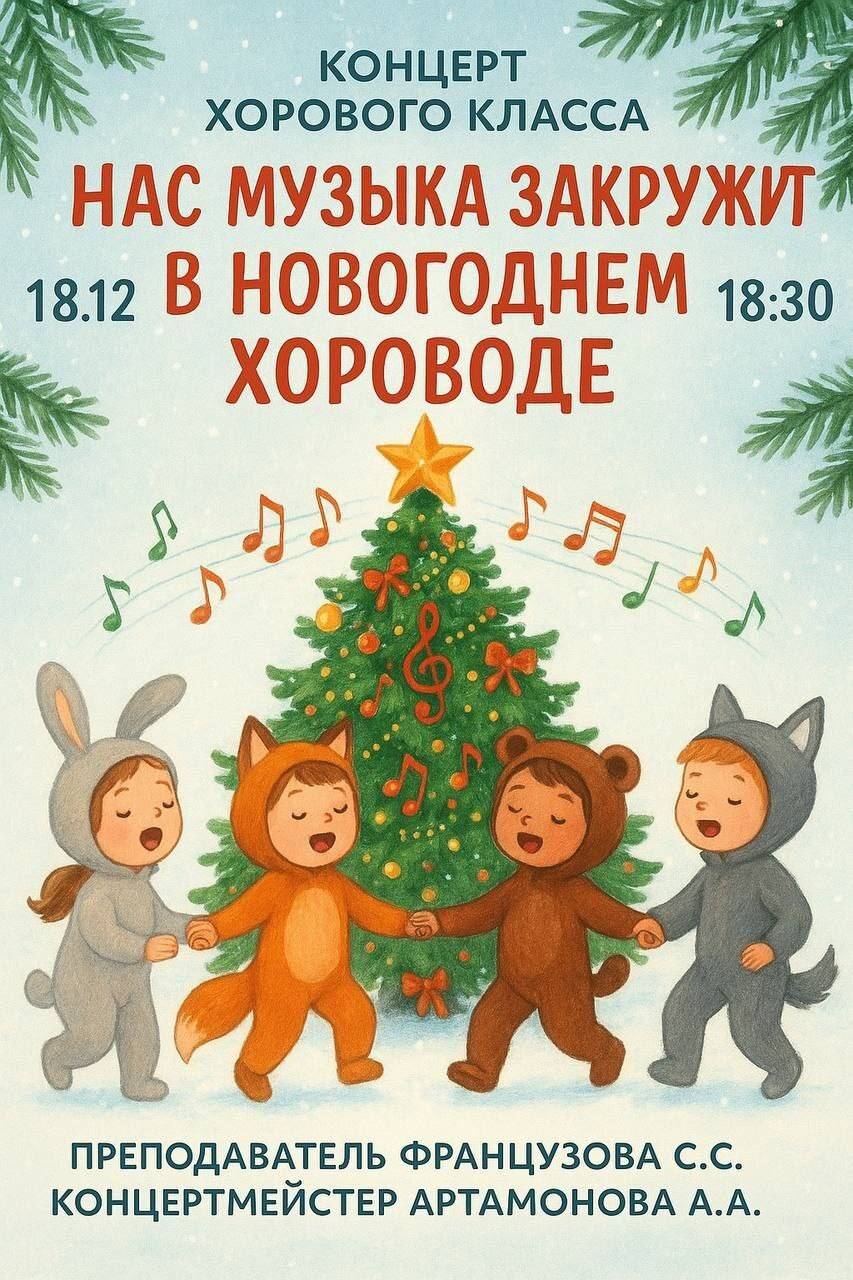 В Детской школе искусств №2 им.П.И.Чайковского прошёл концерт хорового класса преподавателя Французовой С.С. (концертмейстер Артамонова А.А.)— "Нас музыка закружит в новогоднем хороводе".