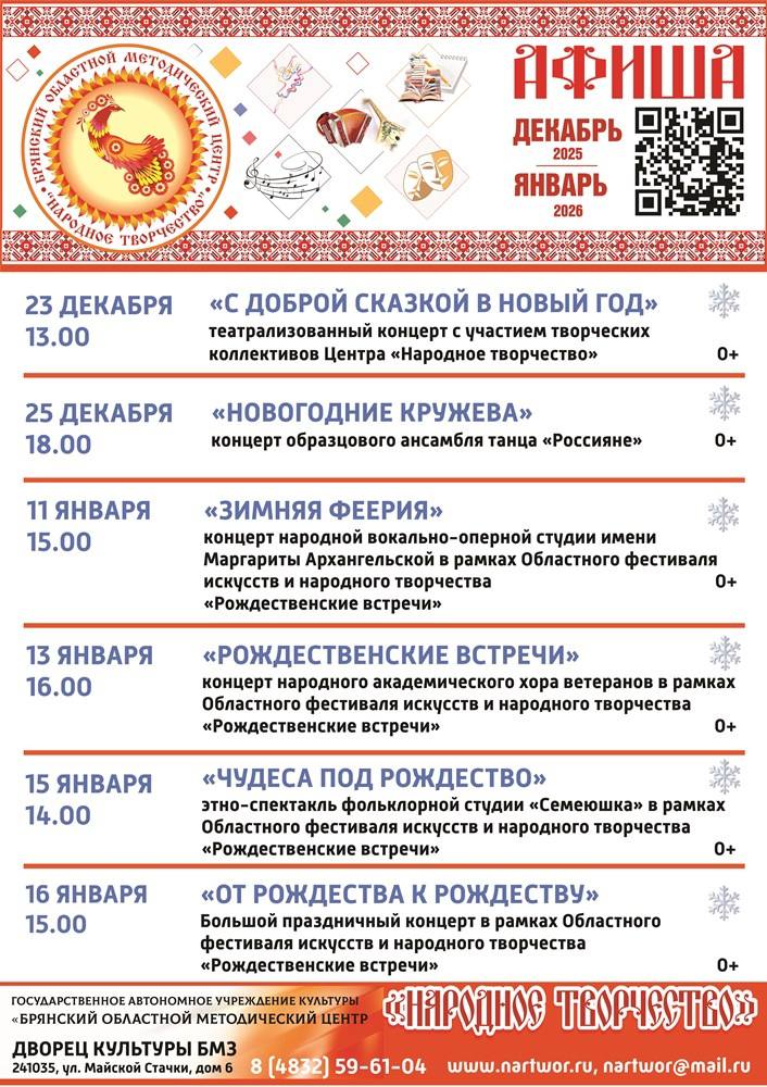 Брянский областной методический центр «Народное творчество», представляем вашему вниманию афишу новогодних мероприятий!