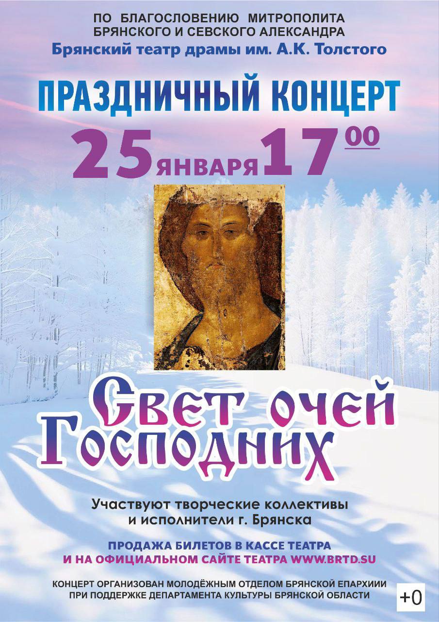 Приглашаем вас на ежегодный праздничный концерт «Свет очей Господних», посвящённый зимним русским народным праздникам церковного календаря. Мероприятие проходит по благословению Митрополита Брянского и Севского Александра.