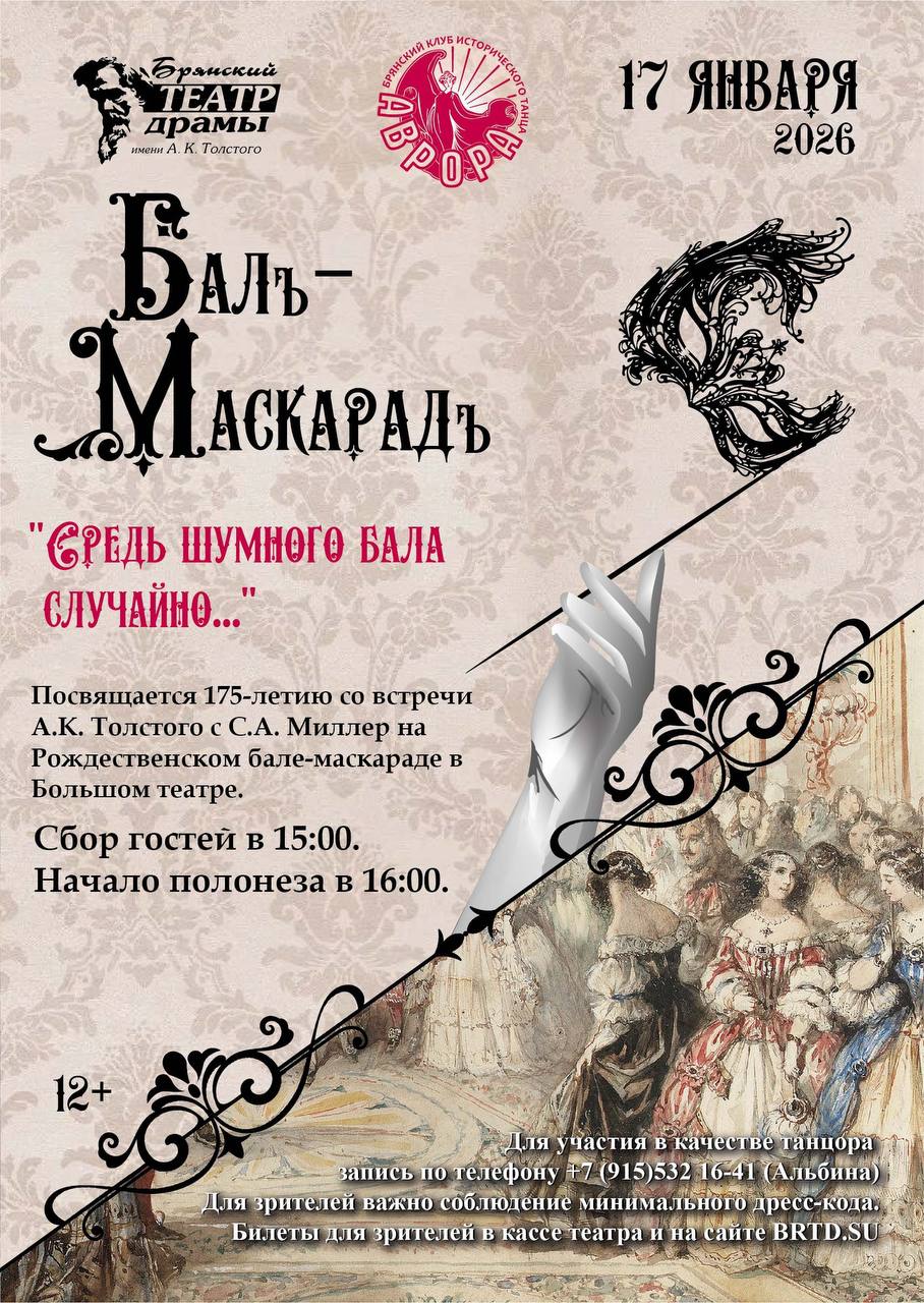 17 января в Брянском театре драмы имени А.К. Толстого состоится бал-маскарад «Средь шумного бала...», посвящённый 175-летию со встречи Алексея Константиновича Толстого и Софьи Андреевны Миллер на Рождественском бале-маскараде в Большом театре.