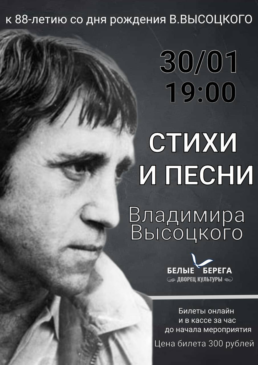 Концерт «Владимир Высоцкий» в Городском Дворце культуры поселка Белые Берега представляет собой уникальное событие, посвященное памяти выдающегося русского поэта, актера и исполнителя Владимира Семеновича Высоцкого. Этот концерт – дань уважения великому таланту, чье творчество продолжает оставаться актуальным и любимым несколькими поколениями слушателей.