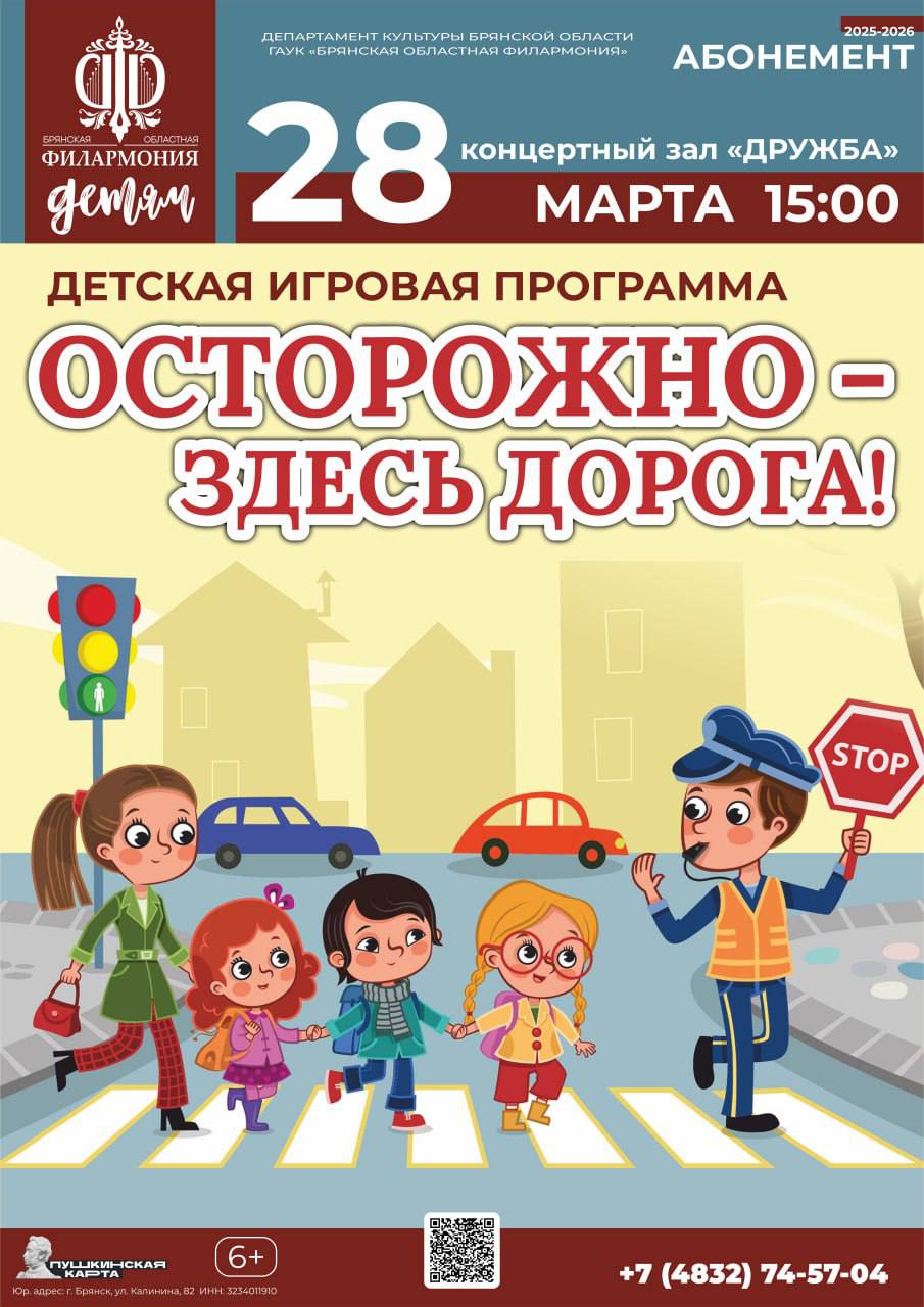 28 марта в 15.00 на сцене к/з «Дружба» Брянская областная филармония представляет детскую игровую программу «Осторожно, здесь дорога!».