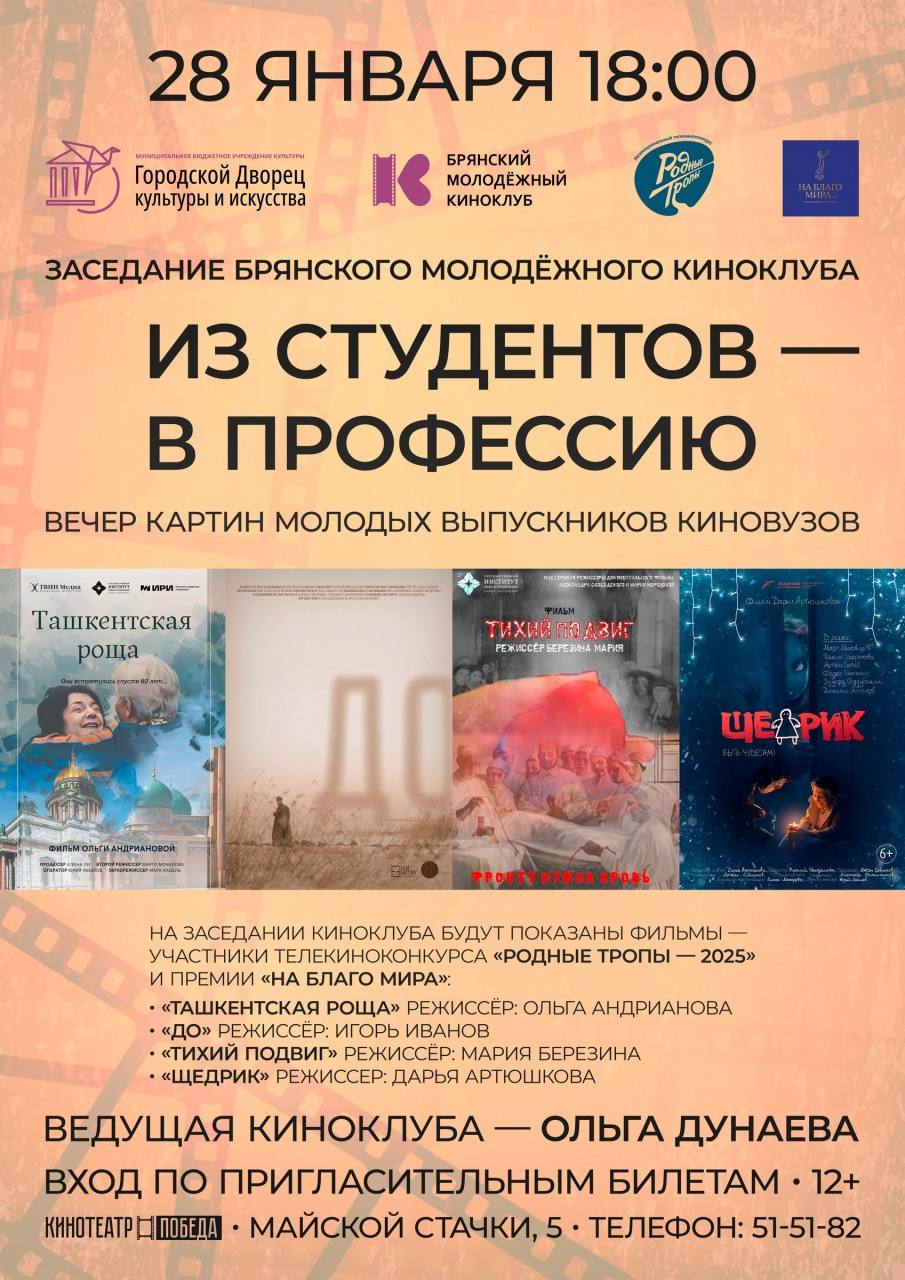 Городской Дворец культуры и искусства приглашает зрителей на встречу Брянского молодёжного киноклуба.