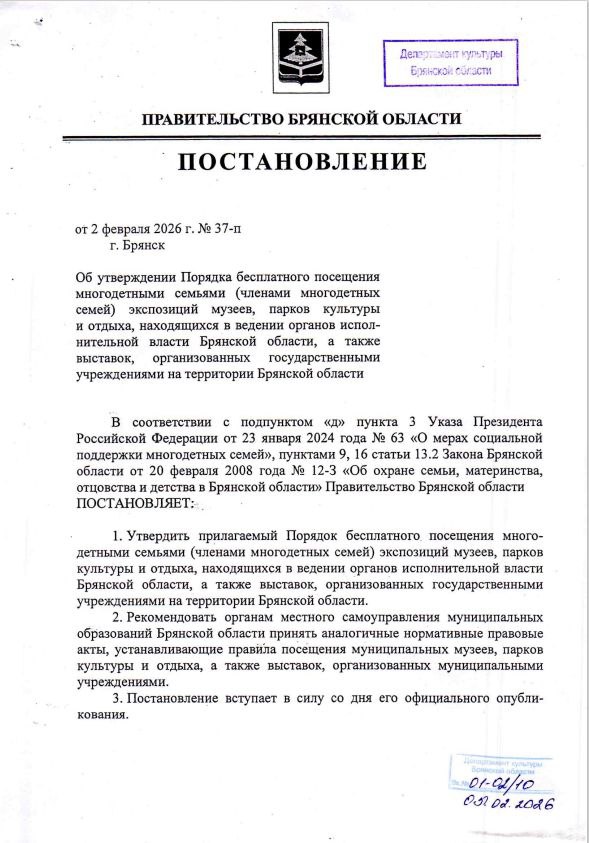 Постановлением Правительства Брянской области от 2 февраля т.г. 37-п утверждён порядок по которому члены многодетных семей смогут в любое удобное для них время бесплатно посещать государственные музеи, выставки, а также парки культуры и отдыха.