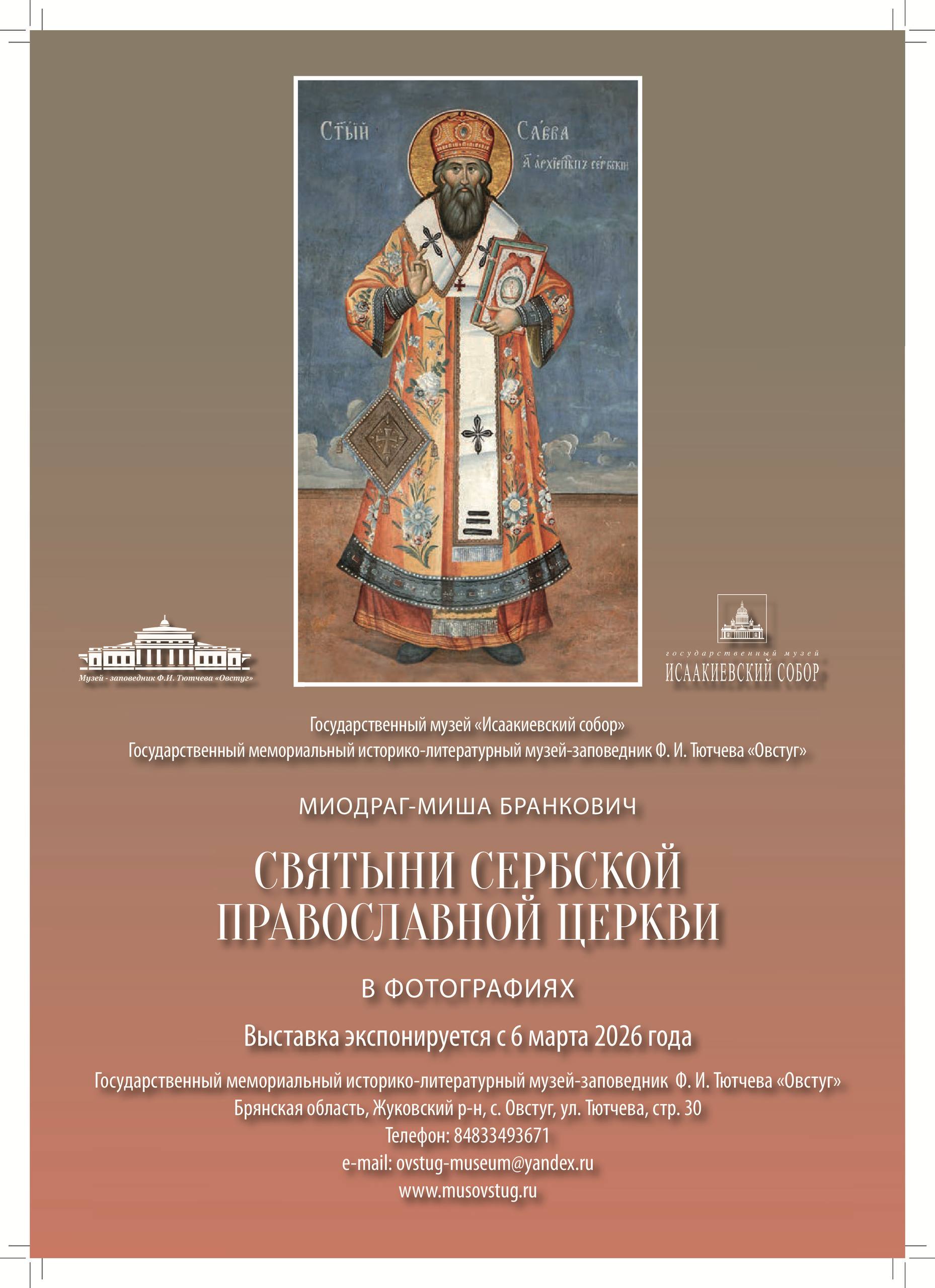 6 марта в 12.00 в музее-заповеднике Ф.И. Тютчева «Овстуг» пройдет открытие выставочного проекта «Святыни Сербской православной церкви» (фотограф Миодраг-Миша Бранкович). Выставка подготовлена Государственным музеем «Исаакиевский собор».