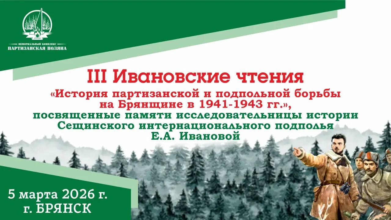 5 марта в Музее истории партизанского движения МК «Партизанская поляна» состоится научно-практическая конференция «История партизанской и подпольной борьбы на Брянщине в 1941–1943 гг.», посвященная памяти исследовательницы истории Сещинского интернационального подполья Е. А. Ивановой (III Ивановские чтения).