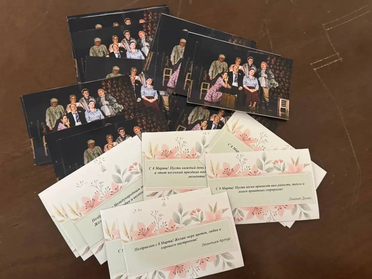 Прекрасным дамам, посетившим спектакль, вручили эксклюзивные фото-открытки, с теплыми пожеланиями от артистов театра. Эти приятные сюрпризы в виде памятных подарков добавили особую праздничную атмосферу происходящему.