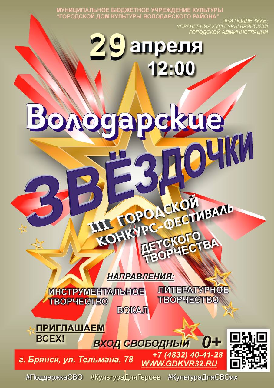 Приглашаем детей в возрасте от 6 до 16 лет принять участие во III ГОРОДСКОМ КОНКУРСЕ-ФЕСТИВАЛЕ ДЕТСКОГО ТВОРЧЕСТВА "ВОЛОДАРСКИЕ ЗВЁЗДОЧКИ"!