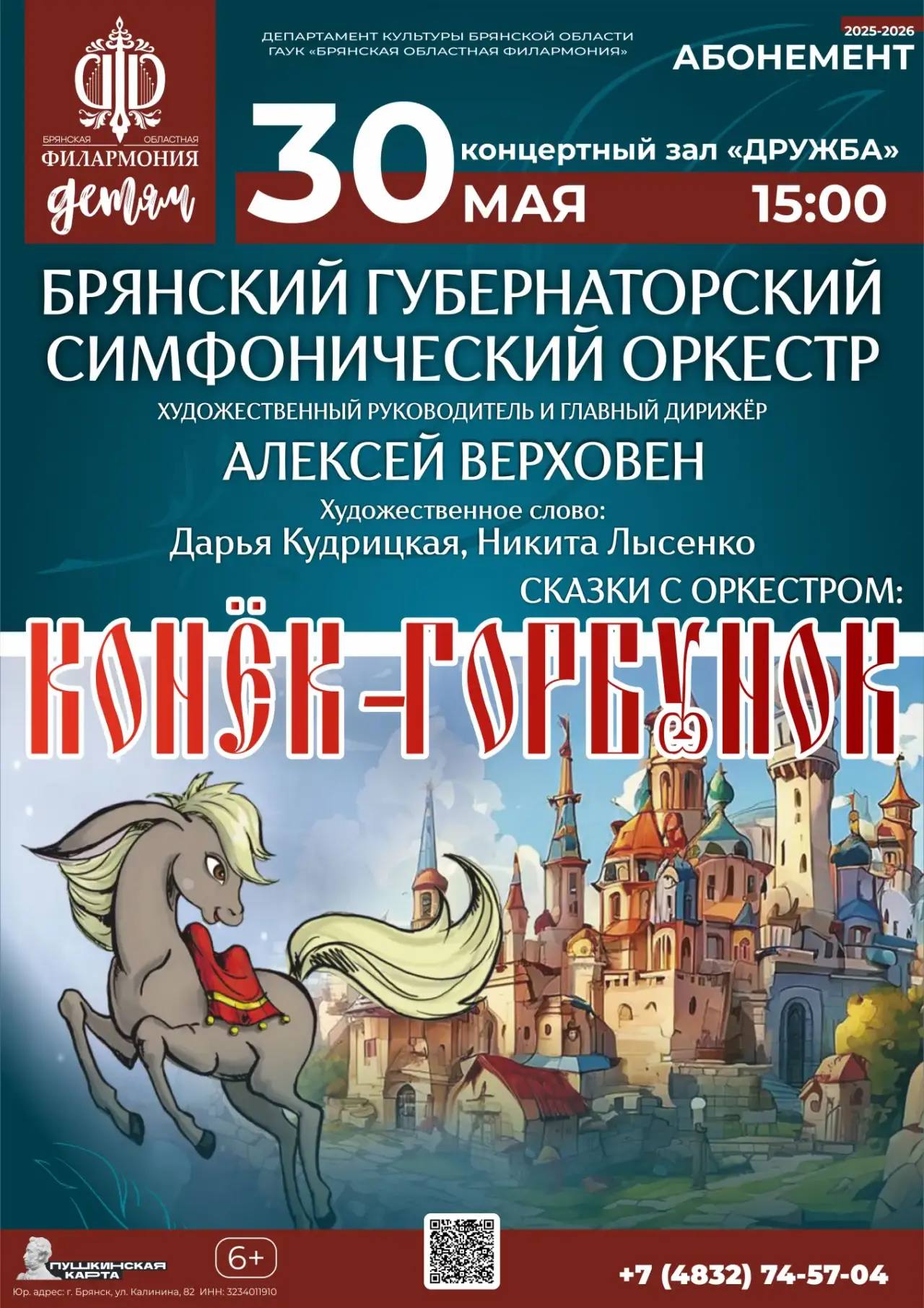 30 мая в 15.00 в к/з «Дружба» состоится концерт Брянского Губернаторского симфонического оркестра под управлением художественного руководителя и главного дирижёра Алексея Верховена — «Сказки с оркестром: «Конёк-Горбунок».