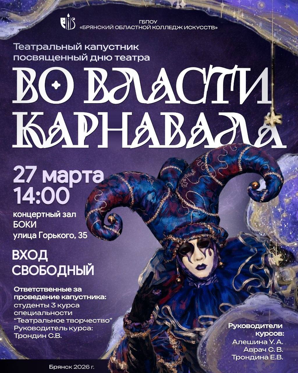 27 марта 2026 г. в 14.00 в к/з Брянского областного колледжа искусств состоится театральный капустник студентов 3 курса специальности «Театральное творчество», приуроченный к празднованию Всемирного Дня театра!