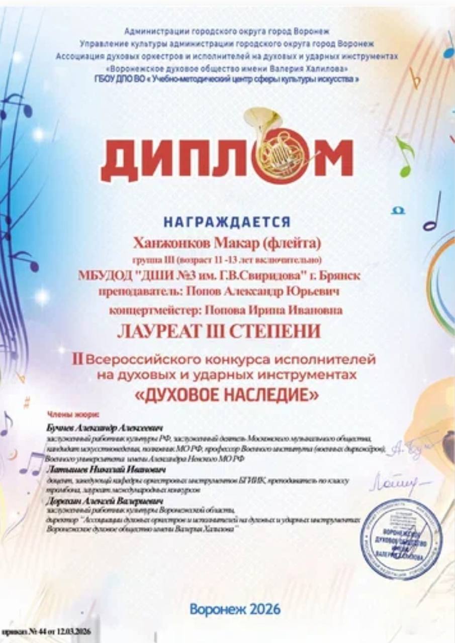 Ассоциация духовых оркестров и исполнителей на духовых инструментах "Воронежское духовое общество имени Валерия Халилова" в дистанционном формате провела II Всероссийский конкурс исполнителей на духовых и ударных инструментах "Духовое наследие".