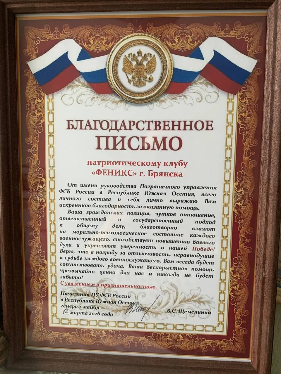 Брянск Пограничное управление ФСБ в Республике Южная Осетия выражает слова благодарности и признательности патриотическому клубу "Феникс" (ГДК им. А. М. Горького) за оказанную помощь.