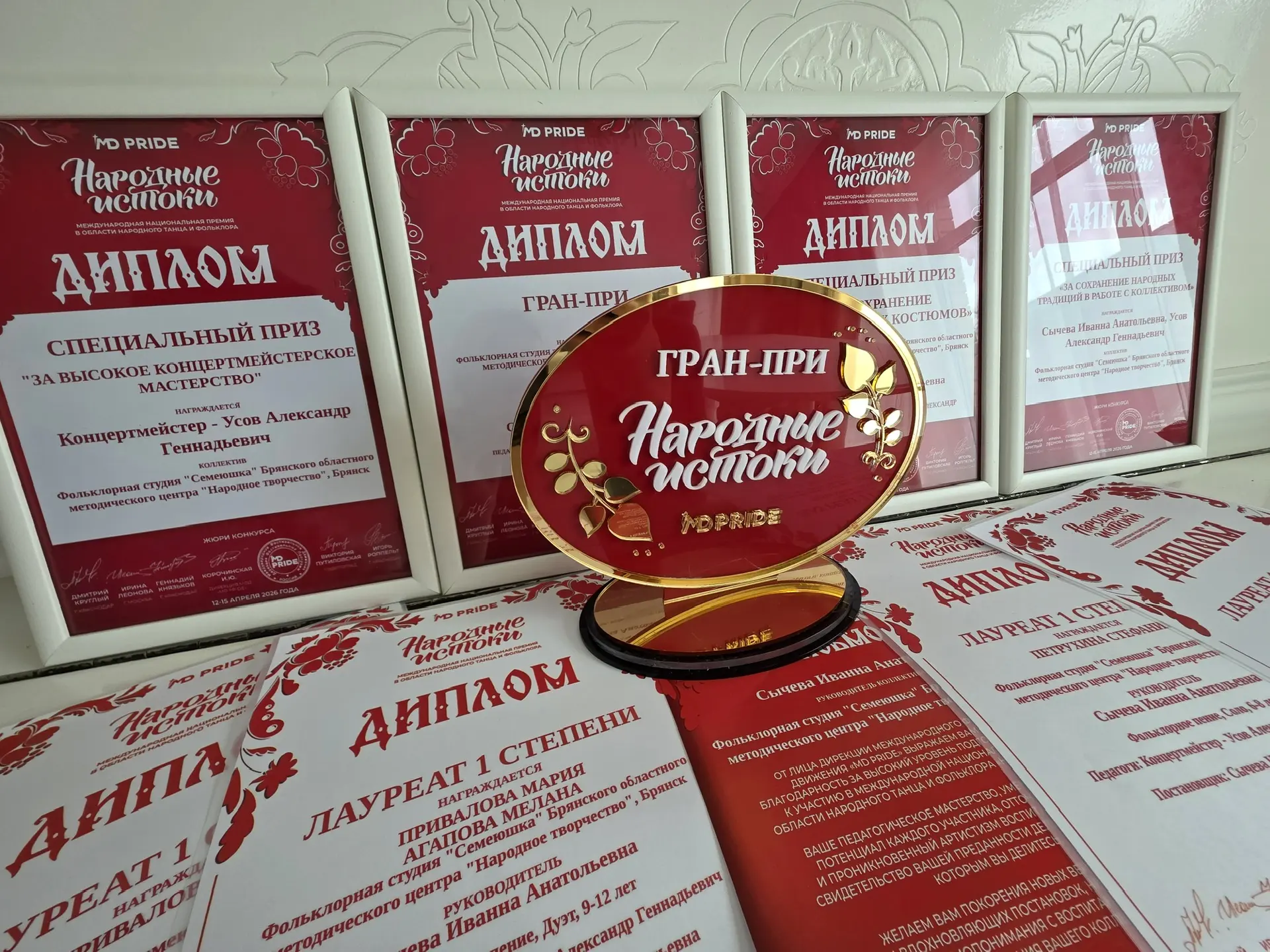 С 12 по 14 апреля 2026 года в г. Сочи прошла Международная национальная Премия в области народного танца и фольклора «Народные истоки», где фольклорная студия «Семеюшка» ГАУК «Брянский областной методический центр «Народное творчество» (руководитель Сычева И.А., концертмейстер Усов А.Г.) с успехом представила Брянскую область, завоевав ГРАН-ПРИ, 8 дипломов Лауреата I степени, 3 специальных приза и приглашение в Китай.