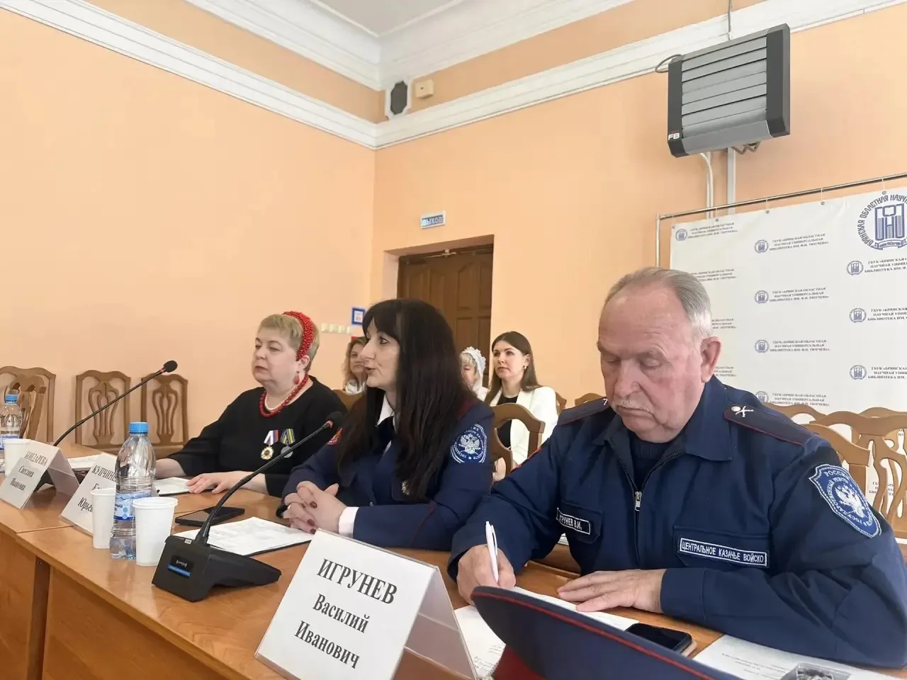 С приветственным словом к участникам круглого стола обратился атаман БОКО ВКО «Центральное казачье войско», казачий полковник Игрунев Василий Иванович. Он отметил важность взаимодействия казачьих обществ с библиотеками в историческом просвещении и сохранении истории и культуры российского казачества, а также в возрождении казачества на исторических землях Стародубского казачьего полка.