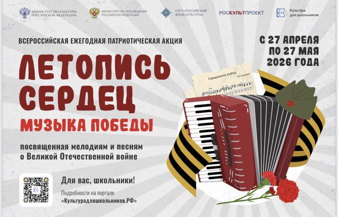 С 27 апреля по 27 мая 2026 года в рамках межведомственного культурнообразовательного проекта «Культура для школьников» пройдет Всероссийская ежегодная патриотическая акция «Летопись сердец. Музыка Победы».