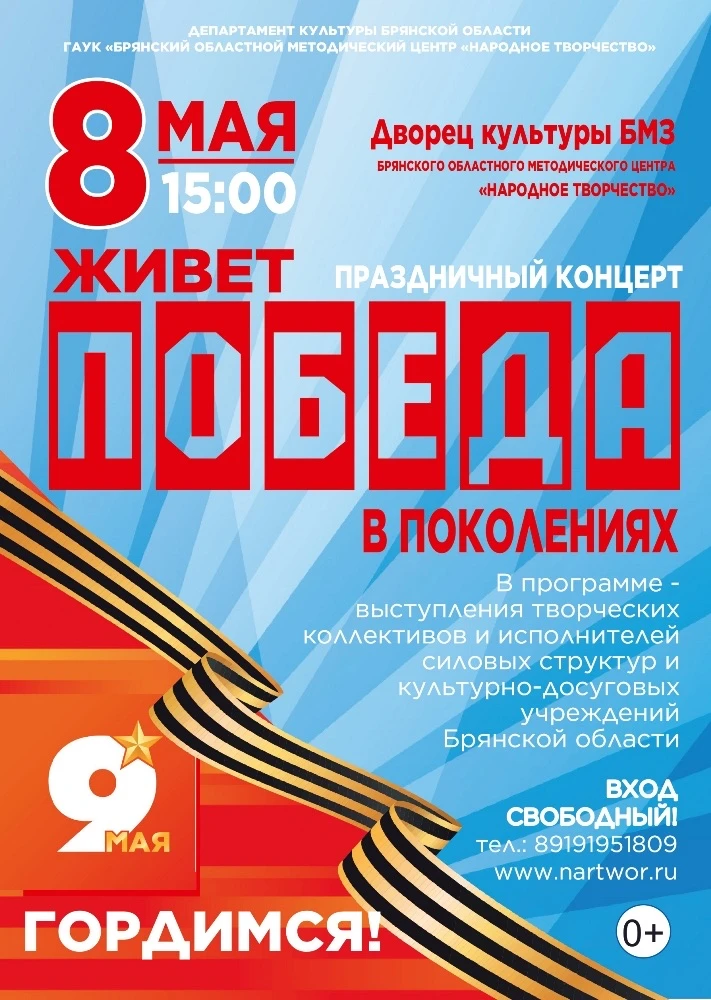 8 мая в 15.00 во Дворце культуры БМЗ Брянского областного методического центра «Народное творчество» состоится большой праздничный концерт «Живет Победа в поколениях», посвященный 81-й годовщине Победы в Великой Отечественной войне 1941-1945 гг.
