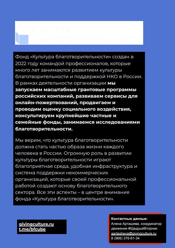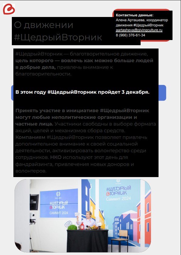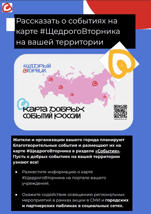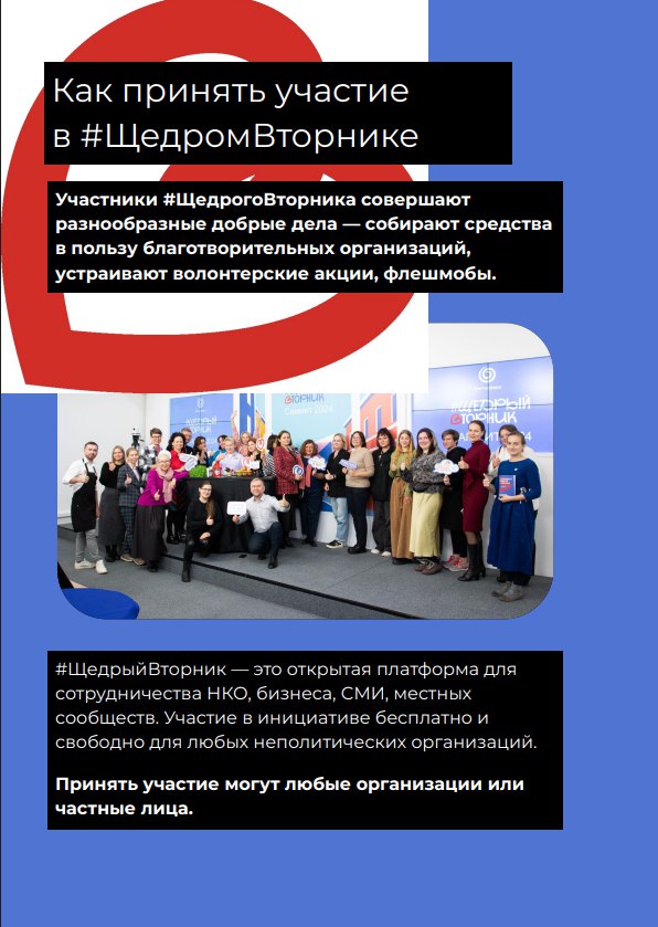 #ЩедрыйВторник — праздник благотворительности, объединяющий людей, компании и НКО для добрых дел. Участники могут быть гостями, волонтёрами, организаторами, донорами, партнёрами или идейными вдохновителями.