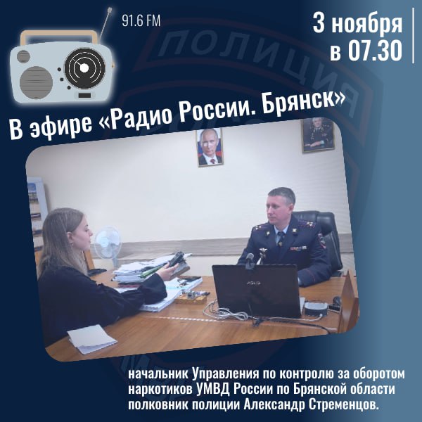 Друзья, завтра в 07.30 в эфире «Радио России. Брянск» 91.6 FM выступит начальник Управления по контролю за оборотом наркотиков УМВД России по Брянской области полковник полиции Александр Стременцов.