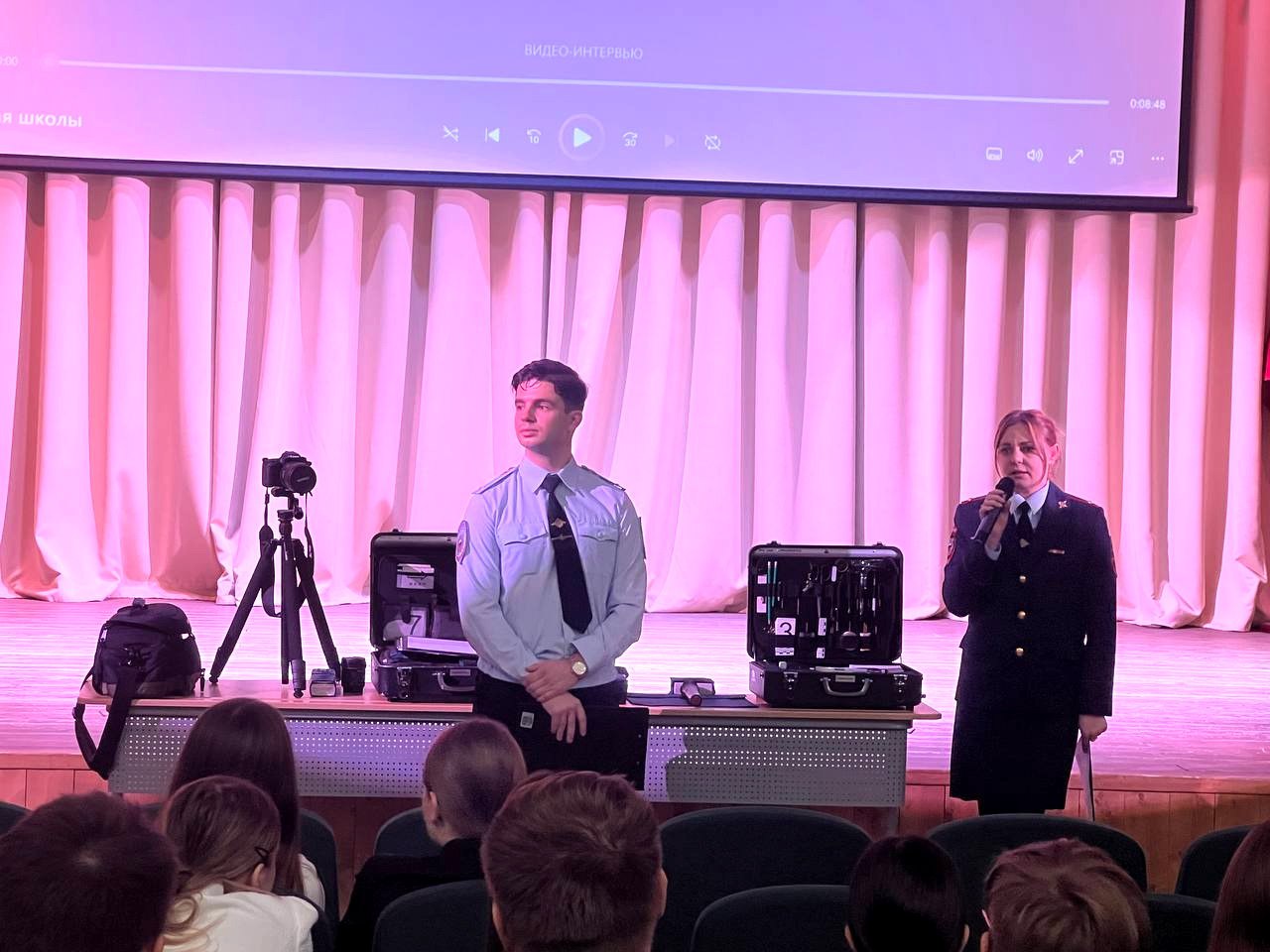 Выступая перед учащимися, полицейские показали ребятам видео с осмотра места происшествия, продемонстрировали, что находится в настоящем чемоданчике эксперта.
