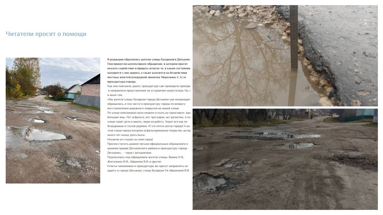 Прокуратурой г. Дятьково по результатам проверки, проведенной после публикации в газете «Дятьковский вестник», установлено, что автомобильная дорога на ул. Базарной в городе содержится в ненадлежащем состоянии. Дорожное покрытие имеет многочисленные повреждения (проломы, просадки, выбоины), создающие угрозу безопасности дорожного движения и повышающие риск ДТП.