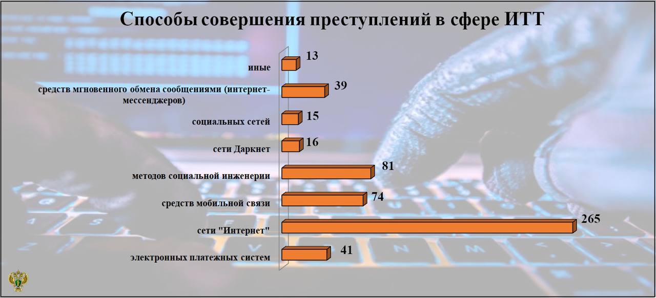 Основные способы совершения таких преступлений включают: использование интернета (265), методов социальной инженерии (81), мобильной связи (74), электронных платежных систем (41), интернет-мессенджеров (39), сети Даркнет (16) и социальных сетей (15).