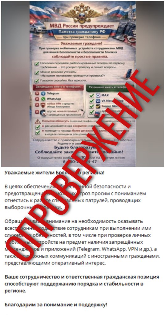 В Брянской области в одном из ТГ-каналов размещена публикация с памяткой о якобы проверке полицейскими личных мобильных устройств на предмет наличия различных мессенджеров и приложений.