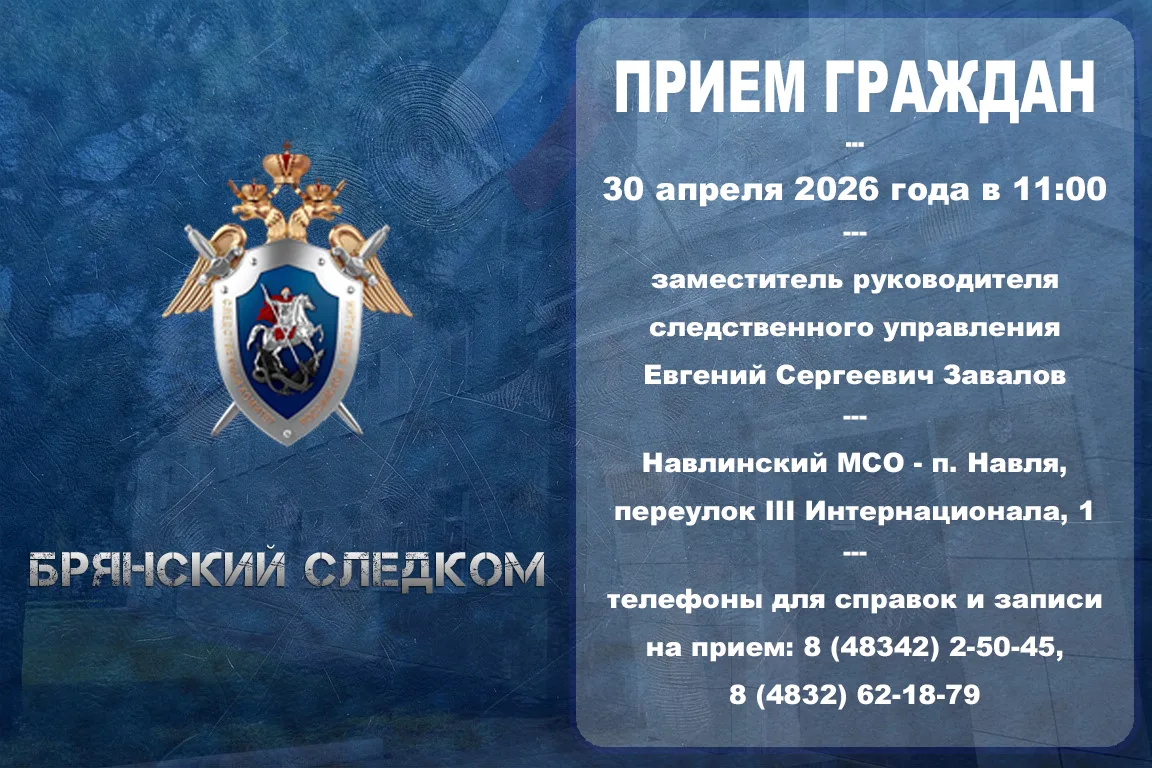 30 апреля 2026 года заместитель руководителя следственного управления Следственного комитета Российской Федерации по Брянской области Евгений Завалов проведет выездной прием граждан в поселке Навля Брянской области.