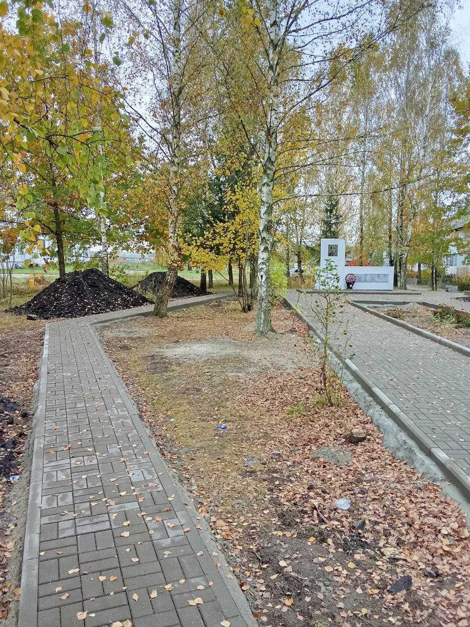 Уложена тротуарная плитка возле памятника, продолжается устройство тротуарных дорожек и засыпка грунтом цветника и газонов.