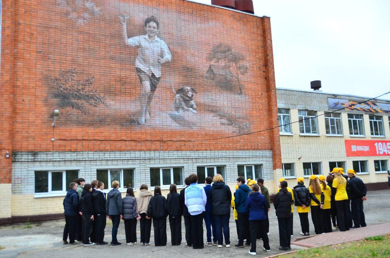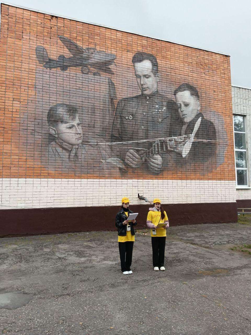«Вот такие муралы теперь украшают фасад школы, полностью авторская работа, основанная на реальных фотографиях. На первой фотографии изобразили Сашу, это правнук дважды Героя Советского Союза, лётчика Павла Михайловича Камозина, который учится в 11 школе Бежицкого района Брянска».