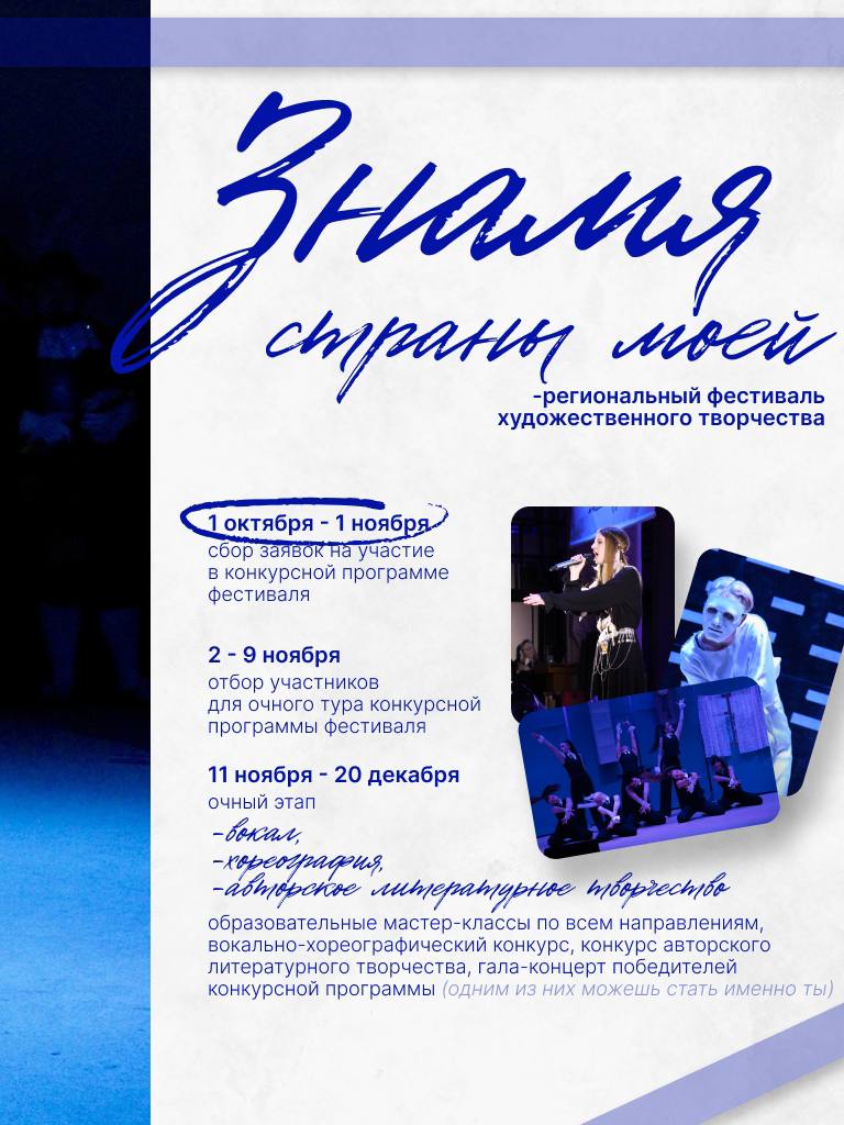 Мы с радостью объявляем старт приема заявок на участие в региональном фестивале художественного творчества «Знамя страны моей»!