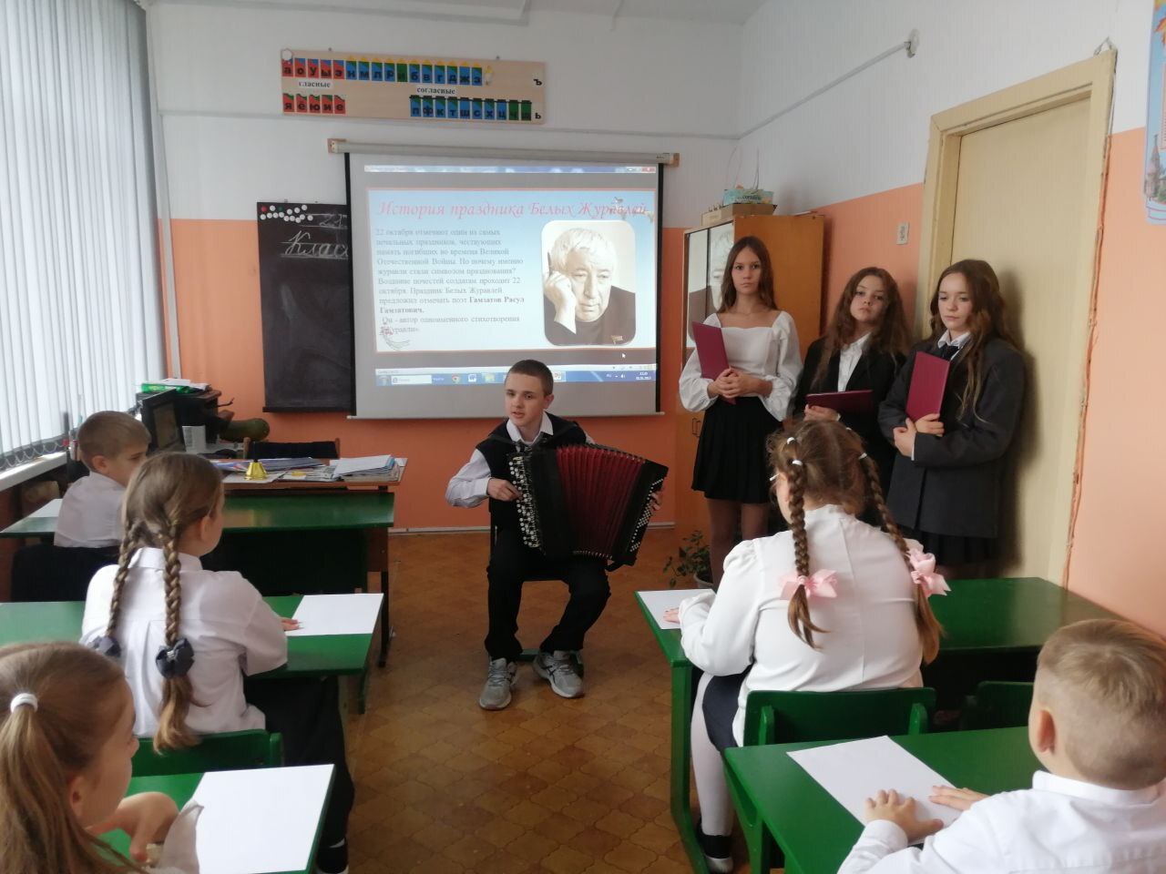 Тендитный Захар, исполнил на баяне трогательную песню "Журавли" Рассула Гамзатова. Его выступление наполнило класс глубокими эмоциями и напомнило о важности памяти и уважения к прошлому.