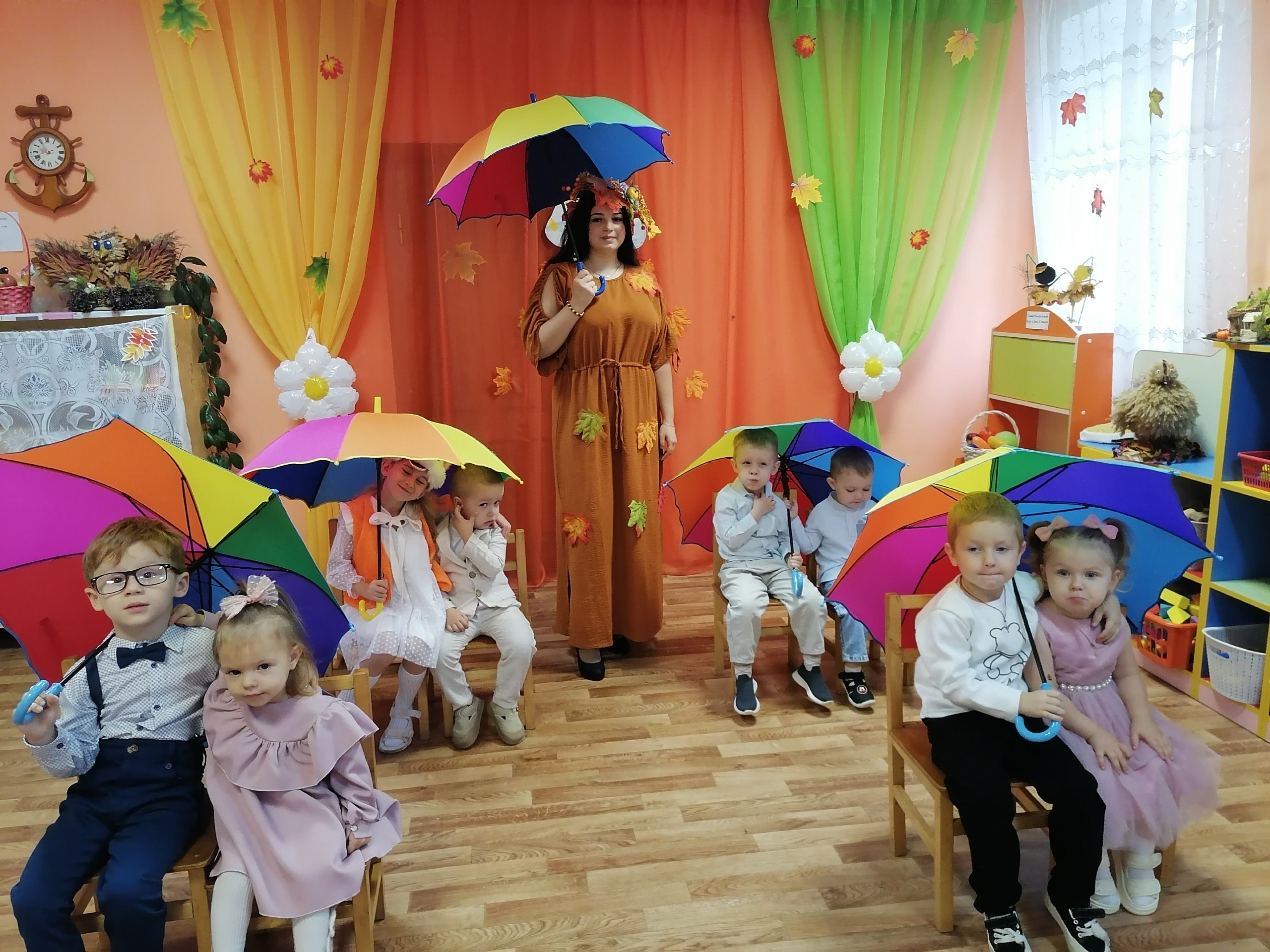 Дети отправились в путешествие в осенний лес, и помогли Лисичке собрать разноцветные листья, шишечки и грибочки. Вместе с Осенью пели песни, исполняли веселые танцы, играли в игры. Ребятам очень понравилось, они были веселые, задорные и радостные.