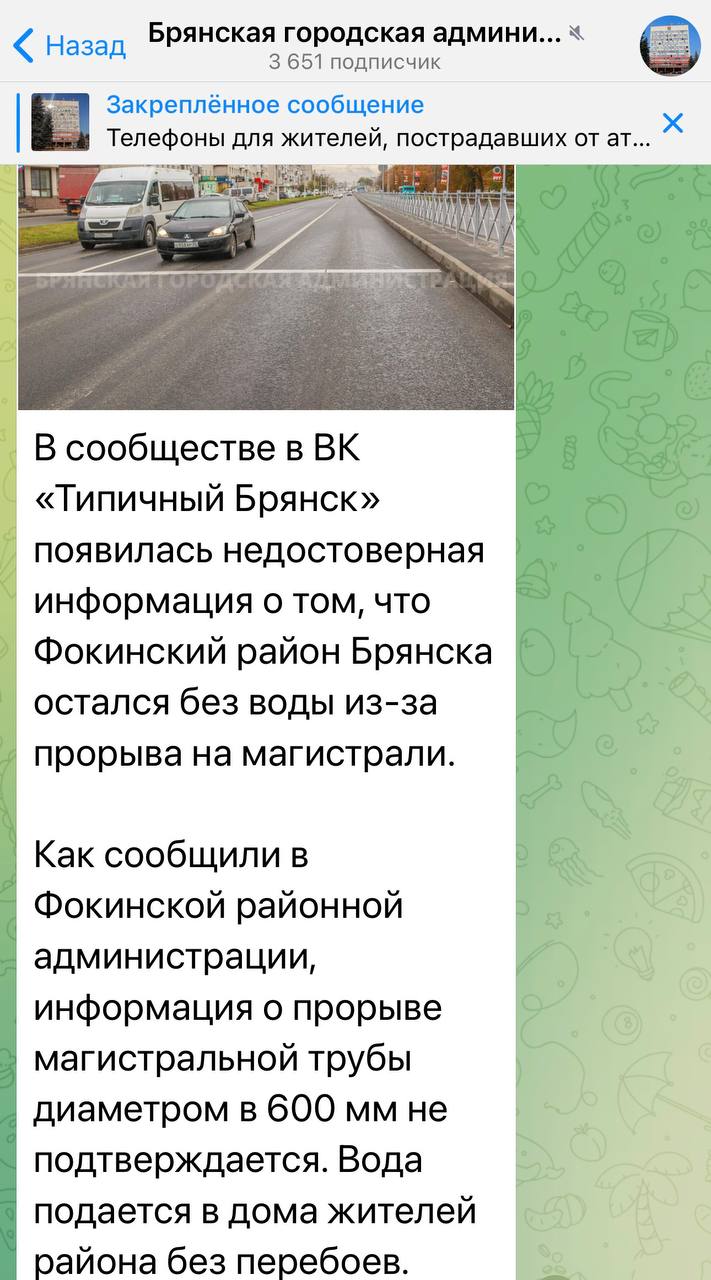 Как сообщили в Фокинской районной администрации, информация о прорыве магистральной трубы диаметром в 600 мм не подтверждается. Вода подается в дома жителей...