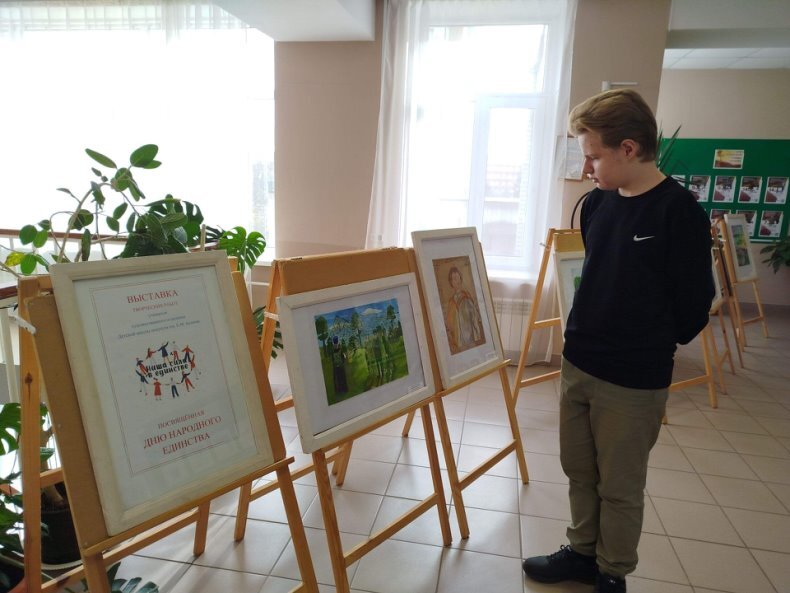 Для юных ценителей изобразительного искусства была оформлена выставка работ учащихся Детской школы искусств им. Е.М. Беляева, посвященная Дню народного единства.