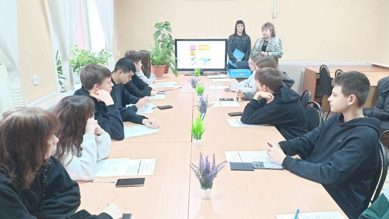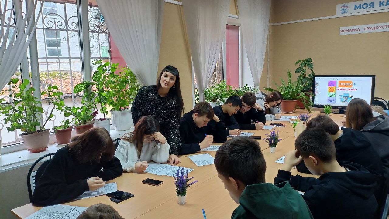 Специалист центра занятости населения -Марина Вера Валерьевна познакомила ребят с основными понятиями, связанными с «Профессией», после чего провела профориентационную игру «Общее дело» из серии «Профи плюс». Во время игры, команды разрабатывали проекты своих будущих компаний, приносящих пользу обществу, затем презентовали результаты своего творчества одноклассникам.