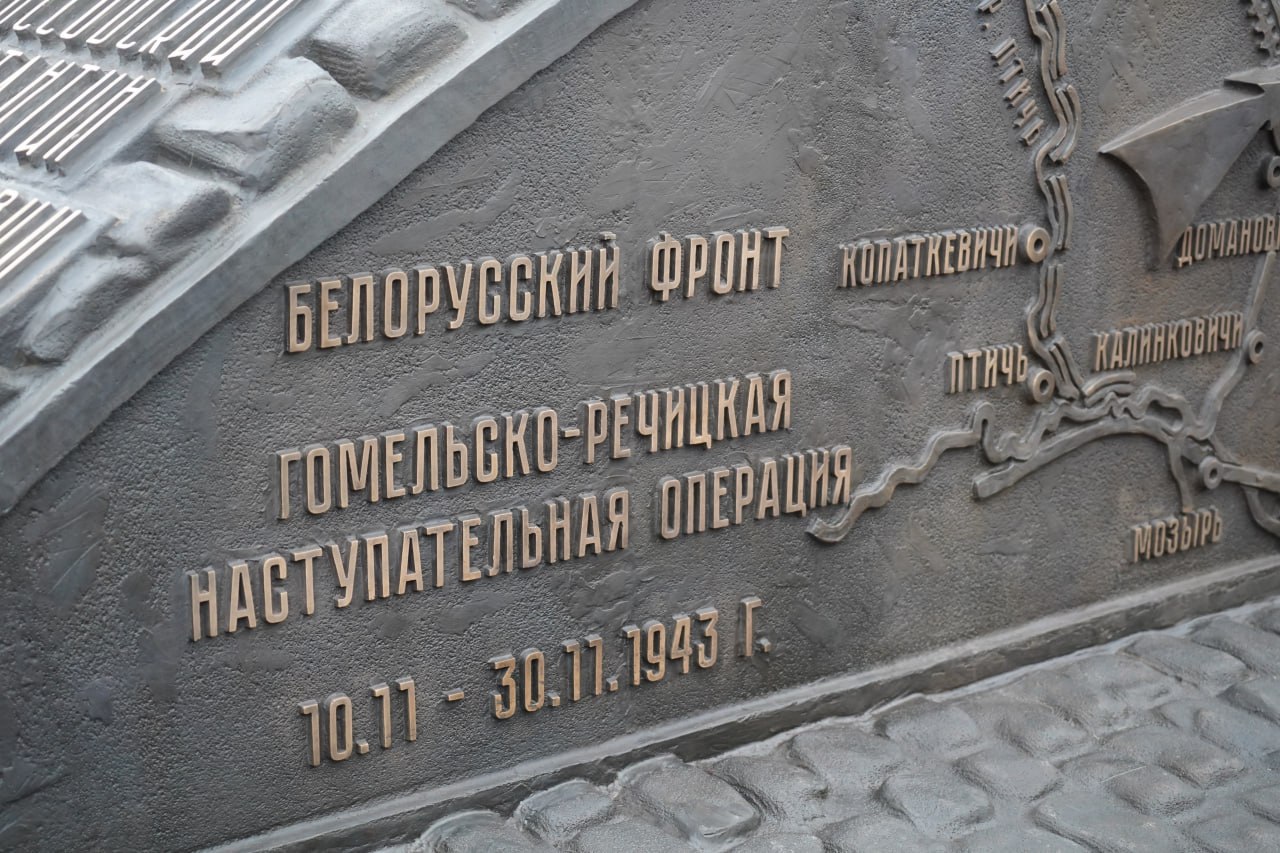 Дважды Герой Советского Союза, Маршал Советского Союза Константин Константинович Рокоссовский в бронзе изображен верхом на коне во время парада Победы 1945 года на Красной площади в Москве. На постаменте – точки ключевых операций и сражений под командованием военачальника. Один из фрагментов постамента — карта Гомельско-Речицкой наступательной операции, которой руководил военачальник, а также образы германских штандартов, брошенных к подножию мавзолея в Москве.