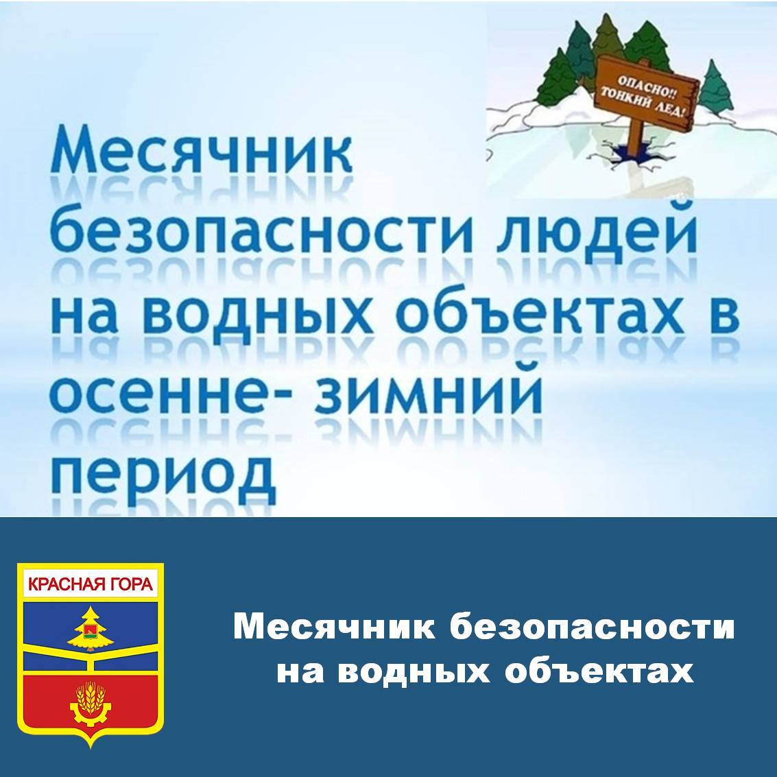 В целях недопущения несчастных случаев, связанных с гибелью людей на водных объектах Брянской области в период ледостава 2025 года, во исполнение положений статей 14,15,16 Федерального закона от 06.10.2003 № 131 -ФЗ «Об общих принципах организации местного самоуправления в Российской Федерации», а также пункта 2 постановления администрации Брянской области от 15.02.2006 № 101 «Об утверждении Правил охраны жизни людей на водных объектах Брянской области», в период с 24.11.2025г. по 24.12.2025 года на территории Красногорского района проводится месячник безопасности на водных объектах в соответствии с «Планом мероприятий по проведению месячника безопасности на водных объектах Брянской области в осенне-зимний период 2025 года».