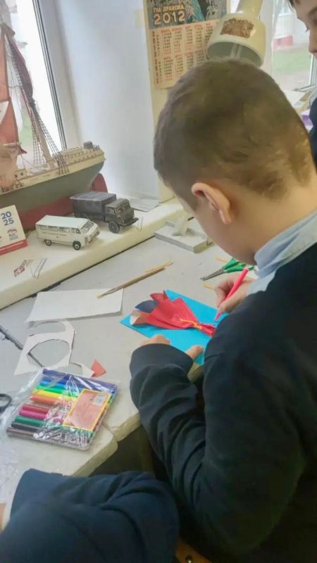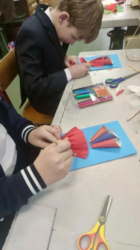 Мальчишки и девчонки с удовольствием мастерили открытки из бумаги.