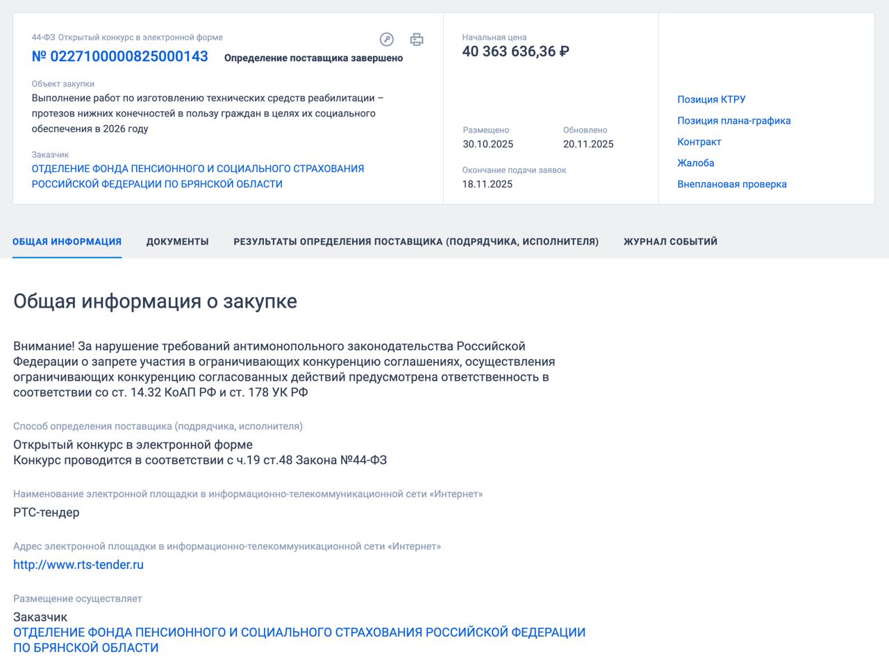Отделение фонда пенсионного и социального страхования России по Брянской области завершило открытый конкурс на изготовление технических средств реабилитации — протезов нижних конечностей для граждан. Начальная цена контракта составляла 40,36 млн рублей.